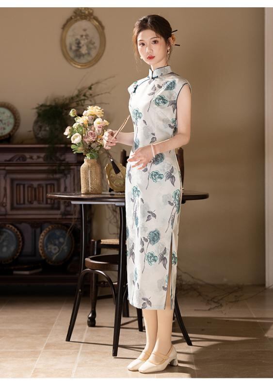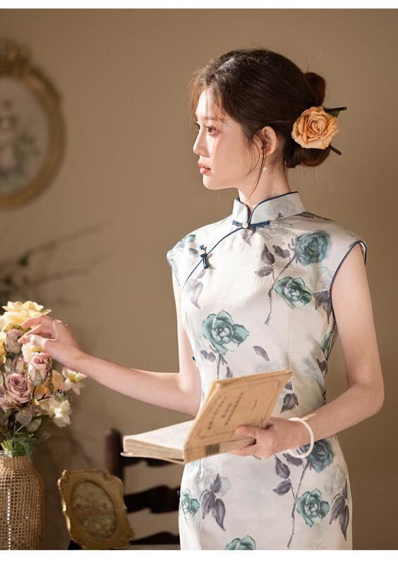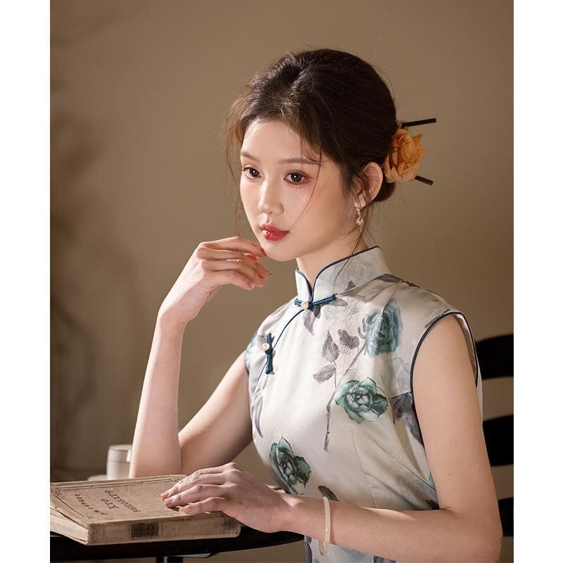 チャイナドレス レディース ニューチャイニーズスタイル レトロ ヴィンテージ モダンデザイン 若者向け エレガント 上品 普段使い 春夏 テンセルジャカード スタンドカラー 斜め襟 半袖 ハイサイドスリット グリーン系