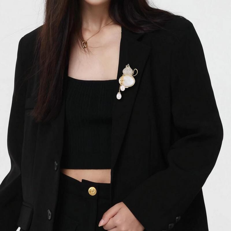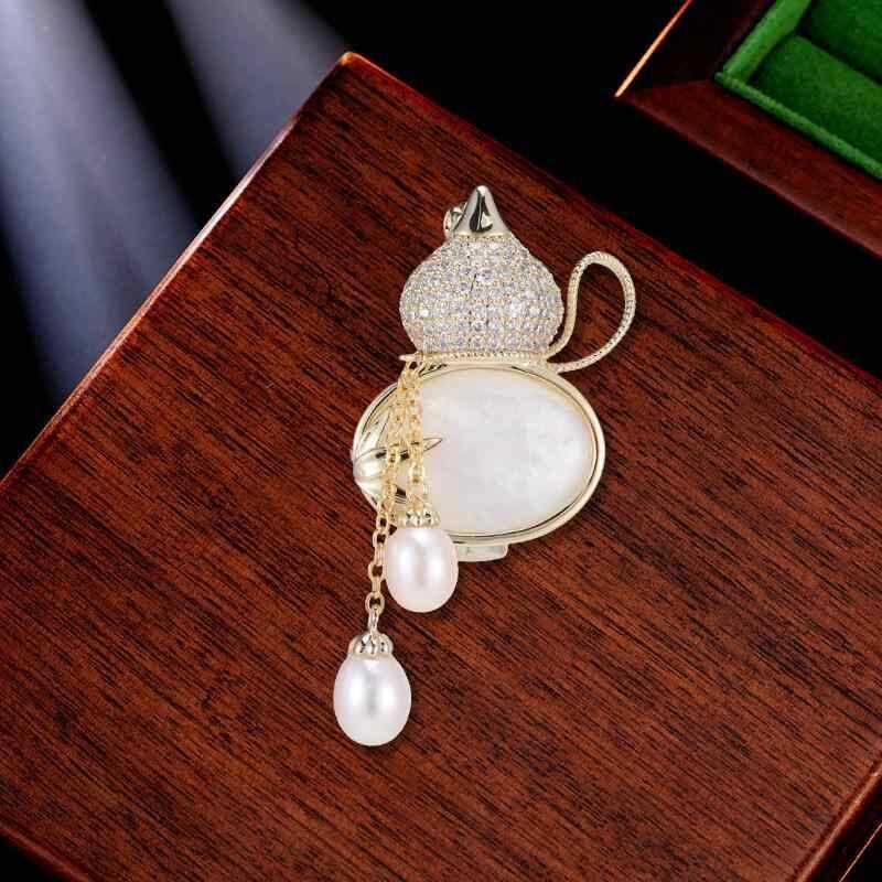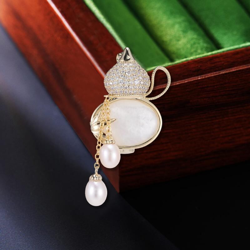ブローチ 女性用 レディース 淡水パール マザーオブパール ひょうたん型 タッセル 高級感 エレガント 上品 コート スーツ ジャケット フォーマル オフィス 普段使い 銅製 金色 電気メッキ ライトラグジュアリー