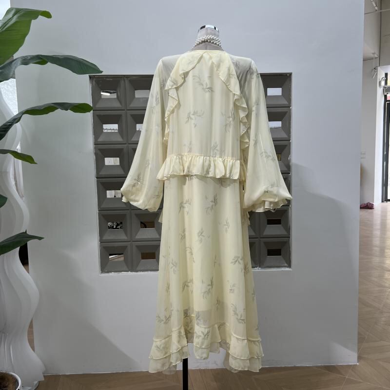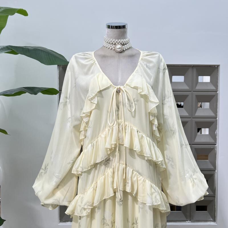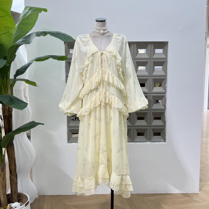 ワンピース レディース Vネック ロング丈 フリル マキシ丈 パフスリーブ ゆったり リラックス 春夏 リゾート フレンチスタイル エレガント カジュアル 体型カバー ポリエステル