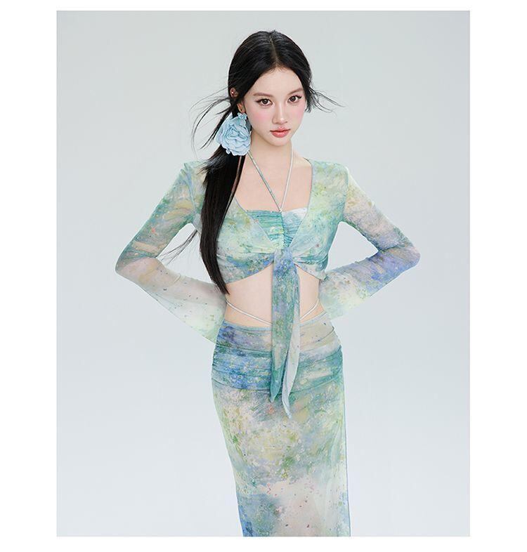 水着 レディース 長袖 セパレート ビキニ 4点セット パッド入り ノンワイヤー 体型カバー 小胸さん向け マキシ丈 ロングスカート 海水浴 プール リゾート 温泉 ビーチ 春夏 ポリエステル グリーン グラデーション