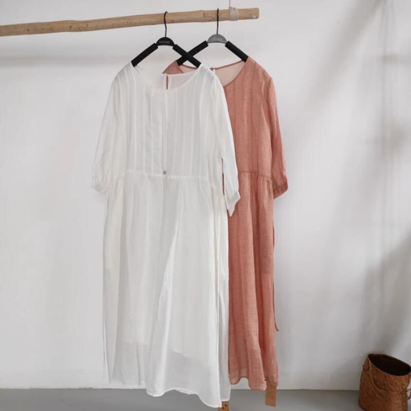 ワンピース レディース 春夏 麻 リネン 無地 ラウンドネック 丸首 七分袖 フレアスカート Aライン ロング丈 マキシ丈 カジュアル リゾート ビーチ 普段使い 体型カバー ゆったり