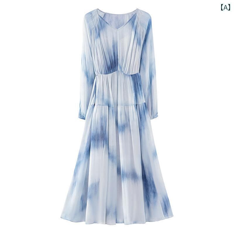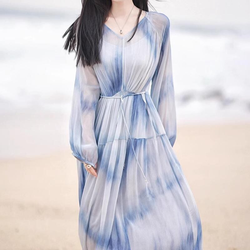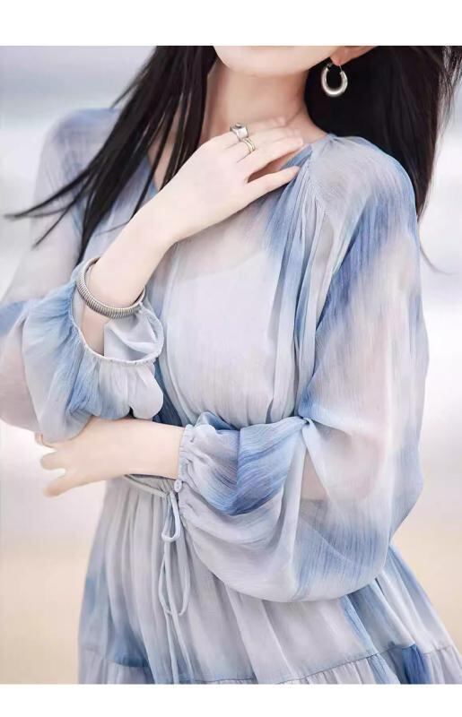 ワンピース レディース ミディ丈 Aライン ポロ襟 パフスリーブ 七分袖 桑蚕絹100% グラデーション 天空の鏡 リゾート 春夏 ビーチ