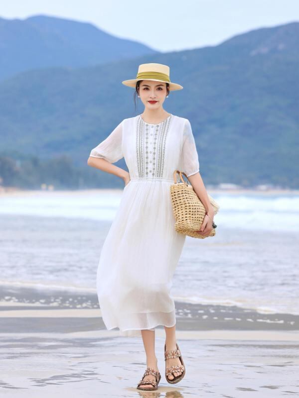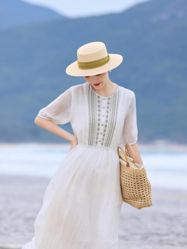 ・カテゴリ: ワンピース・スタイル: 文芸レトロ・デザイン: ベーシック・主な素材: ラミー95%以上・柄: 無地・タイプ: 単品・スカート丈: ロング・スカートシルエット: フレア・ネックライン: クルーネック・袖タイプ: レギュラー・袖丈: 五分袖・ウエスト: ゆったり・デザイン要素: ポケット・カラー: ホワイト(配色刺繍)・サイズ展開: S, M, L, XL