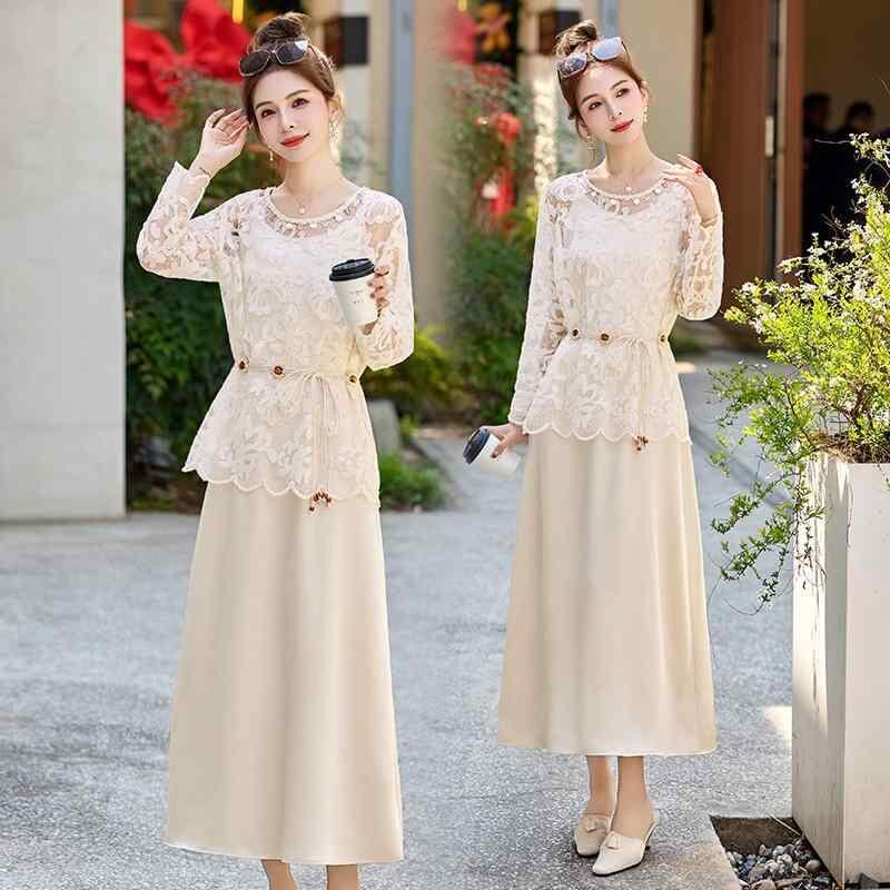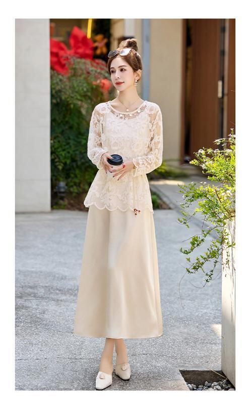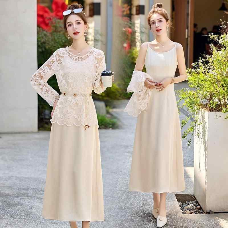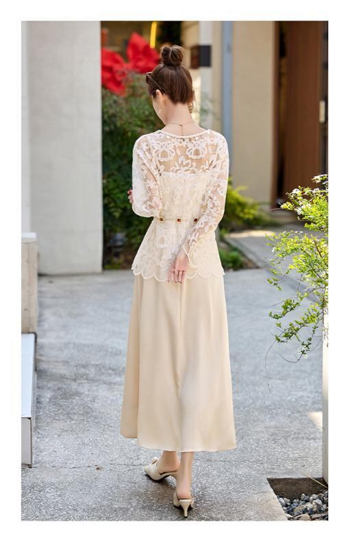 ワンピース キャミソール セットアップ 春夏 フレンチ エレガント リゾートスタイル ウエストマーク ホワイト レース 長袖 ロング丈 Aライン ポリエステル 切り替え