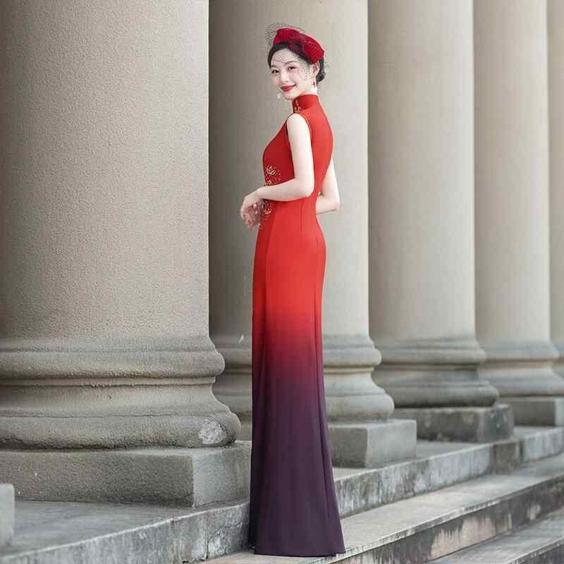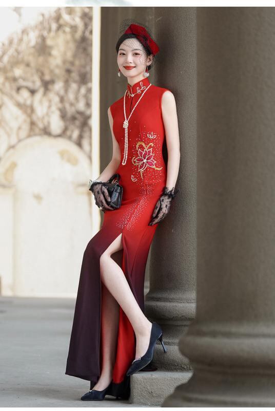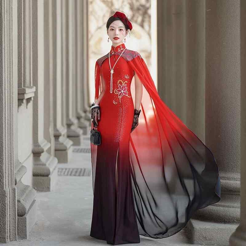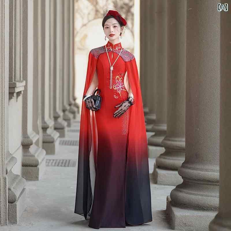 チャイナドレス レディース 高級感 エレガント ロング丈 ノースリーブ スリット入り ショール付き 細見え ステージ 舞台 フォーマル ワンピース ポリエステル 春夏 レトロ