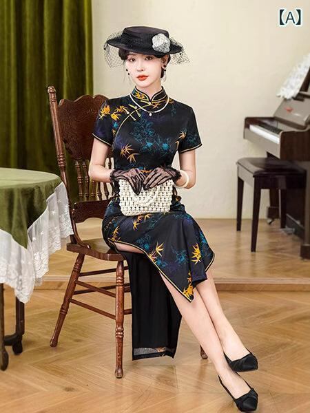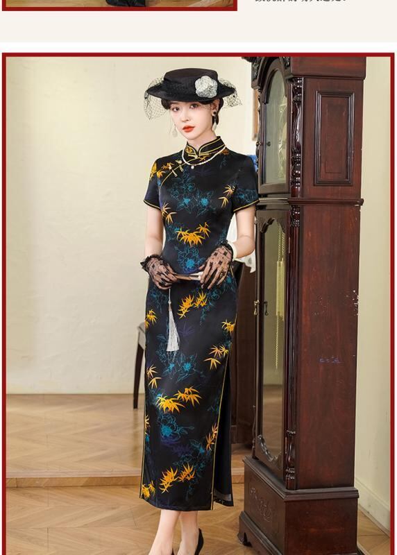 チャイナドレス レディース 高級感 桑蚕シルク ロング丈 ハイネック 半袖 レトロ エレガント 上品 ブラック スリット入り 中華風 ストレッチ 春夏