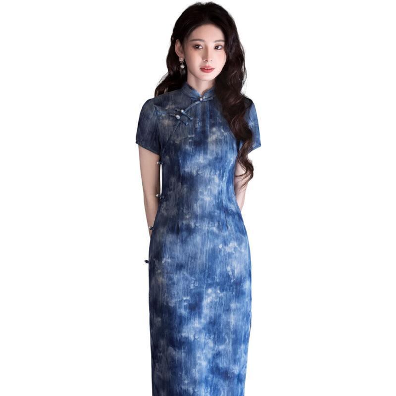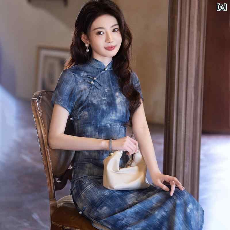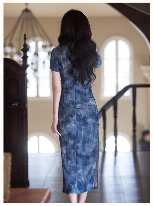 チャイナドレス レディース 春夏 新中華風 水墨画柄 Vネック ロング丈 ブルー 高級感 上品 スタイルアップ 綿麻
