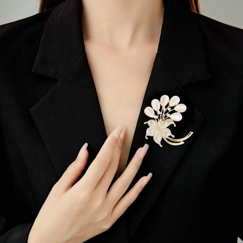 胸ブローチ レディース ファッション キャッツアイ 花束 フラワー 高級感 エレガント 上品 ゴージャス ゴールドカラー 銅製 電気メッキ加工 ジャケット用 ピンブローチ コサージュ 春夏 装飾アクセサリー