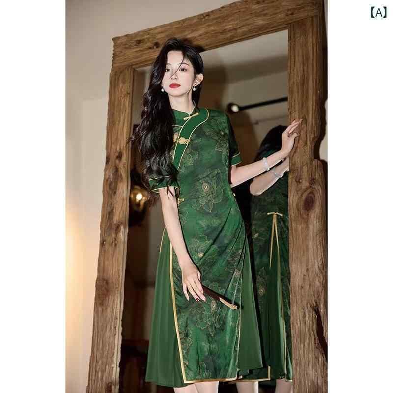 チャイナドレス レディース 春夏 二重 織り柄 ジャガード ワンピース 半袖 ミドル丈 スタンドカラー 斜め合わせ スリット入り モダンエレガント ポリエステル