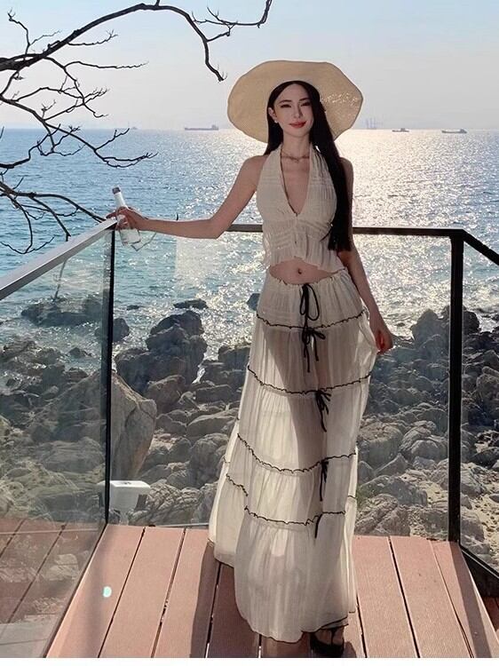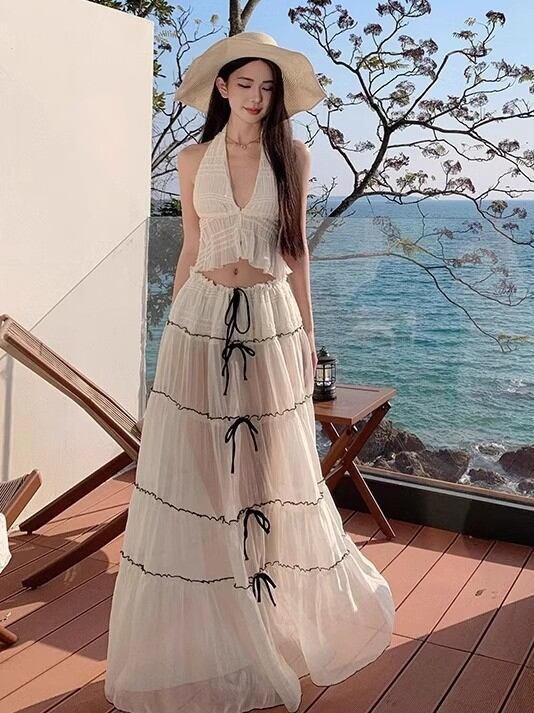 水着 レディース ビキニ セパレート ロング丈スカート 体型カバー 着痩せ スタイルアップ 小胸カバー 胸元隠し 高級感 リゾート 海水浴 ビーチ バカンス スイムウェア サマー ポリエステル ホワイト 白