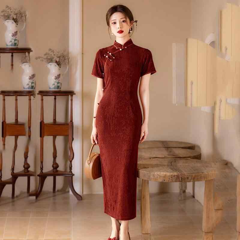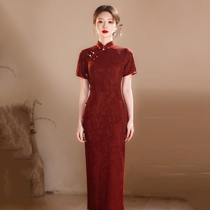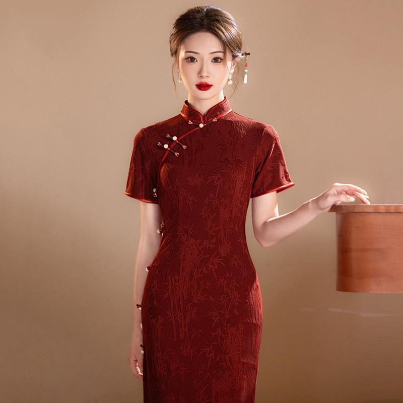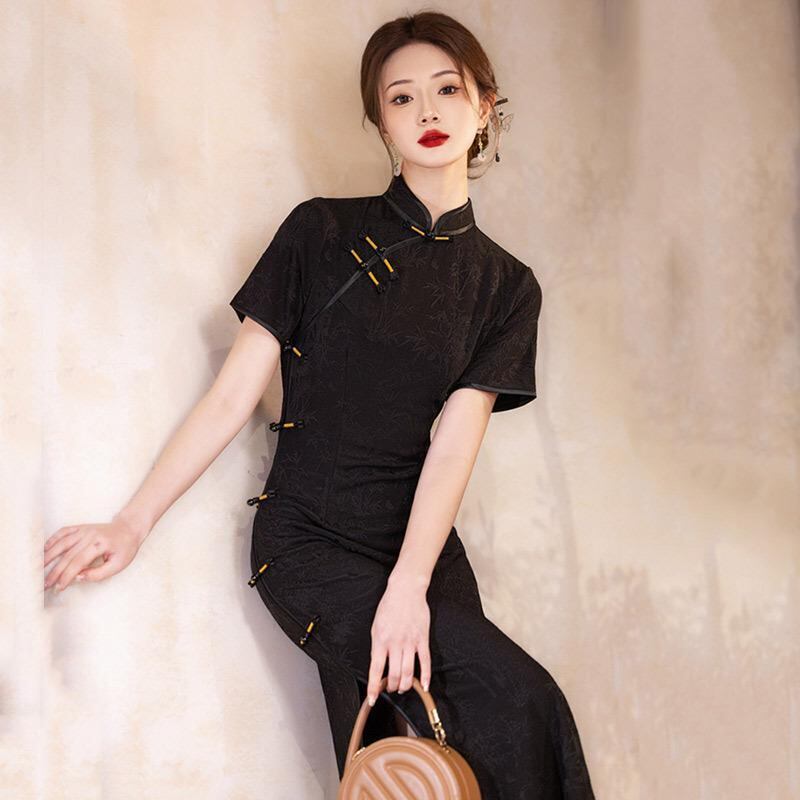 チャイナドレス レディース ワンピース 中国風 女性用 黒色 ロング丈 半袖 夏用 アレンジ レトロ 復古調 スリム 細身 赤色 中華風 向け