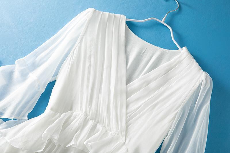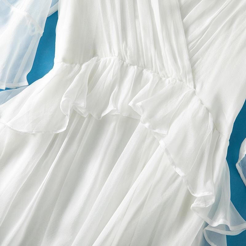 ワンピース レディース 春夏 Vネック フリル袖 ロング丈 マキシ丈 Aライン シルク 桑蚕シルク 切り替え プリント リゾート バカンス ビーチ エレガント フェミニン ホワイト オフホワイト