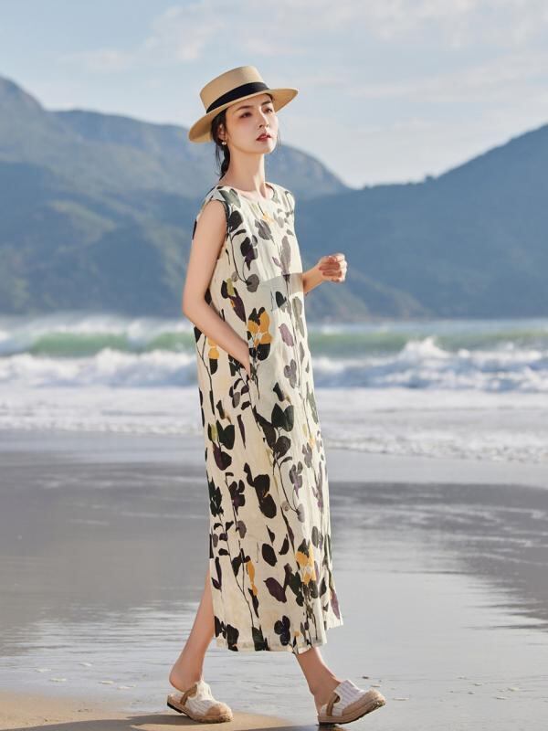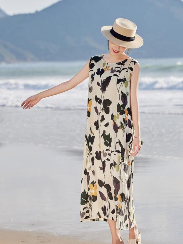ワンピース レディース リゾート 海辺 麻 リネン プリント ロング丈 マキシ丈 ノースリーブ タンクトップワンピース キャミワンピース ラウンドネック ゆったりシルエット ポケット付き レトロ エスニック 春夏