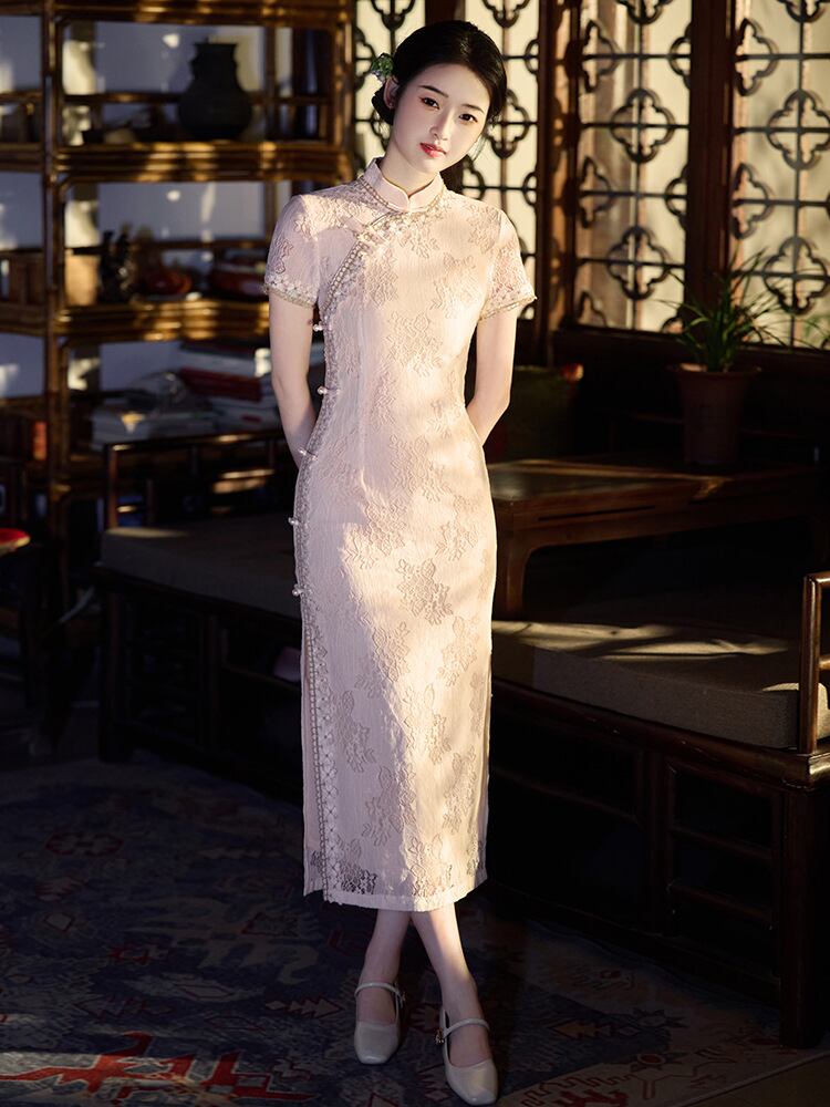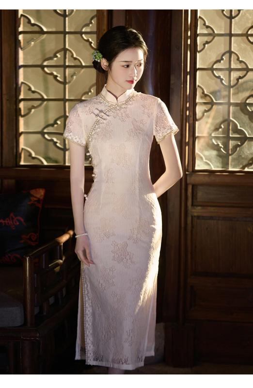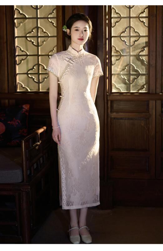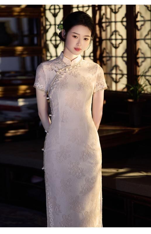 チャイナドレス レディース ホワイト レース ロング丈 改良 新中式 日常使い 普段使い エレガント 上品 清楚 立襟 三分袖 ハイウエストスリット 春夏