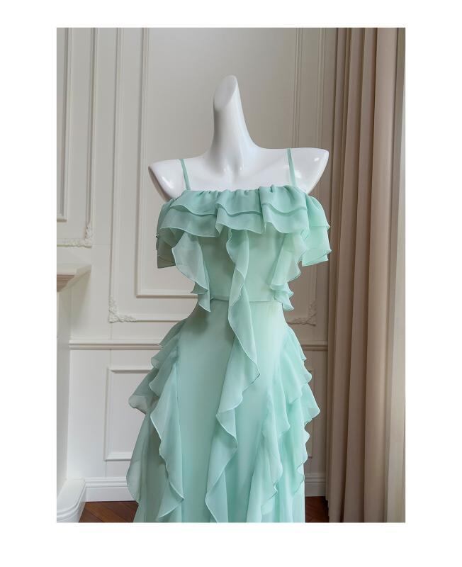 ワンピース レディース フレンチ リゾート バカンス オフショルダー 肩出し キャミソール ロング丈 マキシ丈 ドレス アシンメトリー ヘムライン フリル ウエストマーク シフォン 軽やか ライトグリーン 春夏 上品