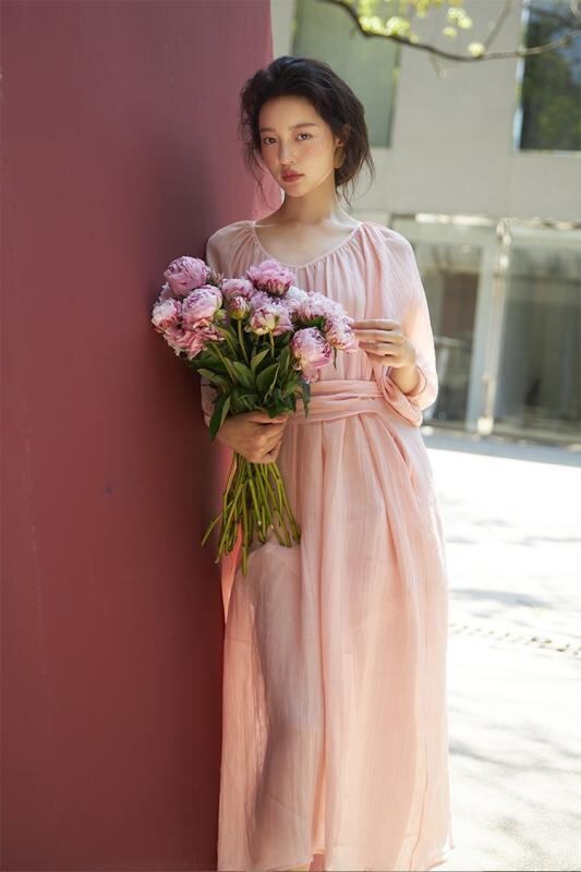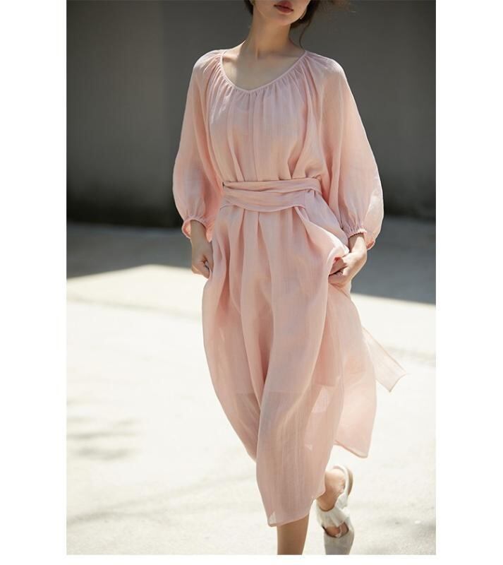 ワンピース レディース フレンチエレガント ピンク 再生繊維 麻 リネン ウエスト ロングリボン ウエストマーク 細見え スタイルアップ ミディ丈 夏 大人 上品 Aライン フレア お出かけ