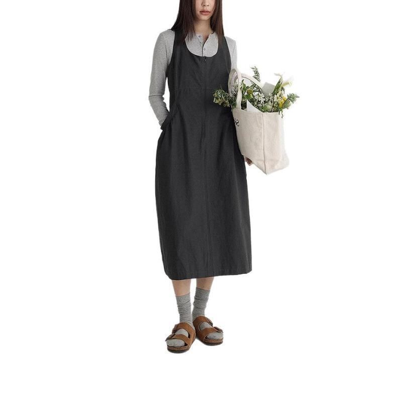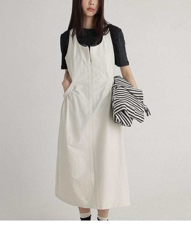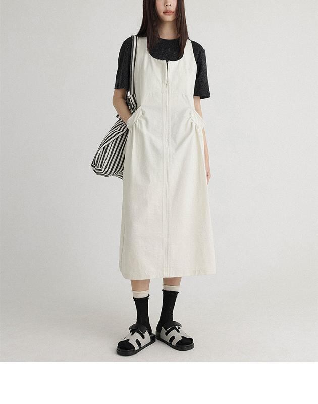 ・カテゴリ: ワンピース・スタイル: エレガントカジュアル・テイスト: リゾート風・デザイン: キャミソール型・主な素材: 綿95%以上・素材2: ナイロン30%以下・柄: 無地・加工: プリーツ加工・セット形式: 単品・丈: ミディ丈・スカートタイプ: Aライン・ネックライン: ワイドUネック・袖丈: ノースリーブ・ウエスト: ゴム・デザイン要素: ポケット・前開き: プルオーバー・カラー展開: アイボリー、チャコールグレー・サイズ展開: M、L