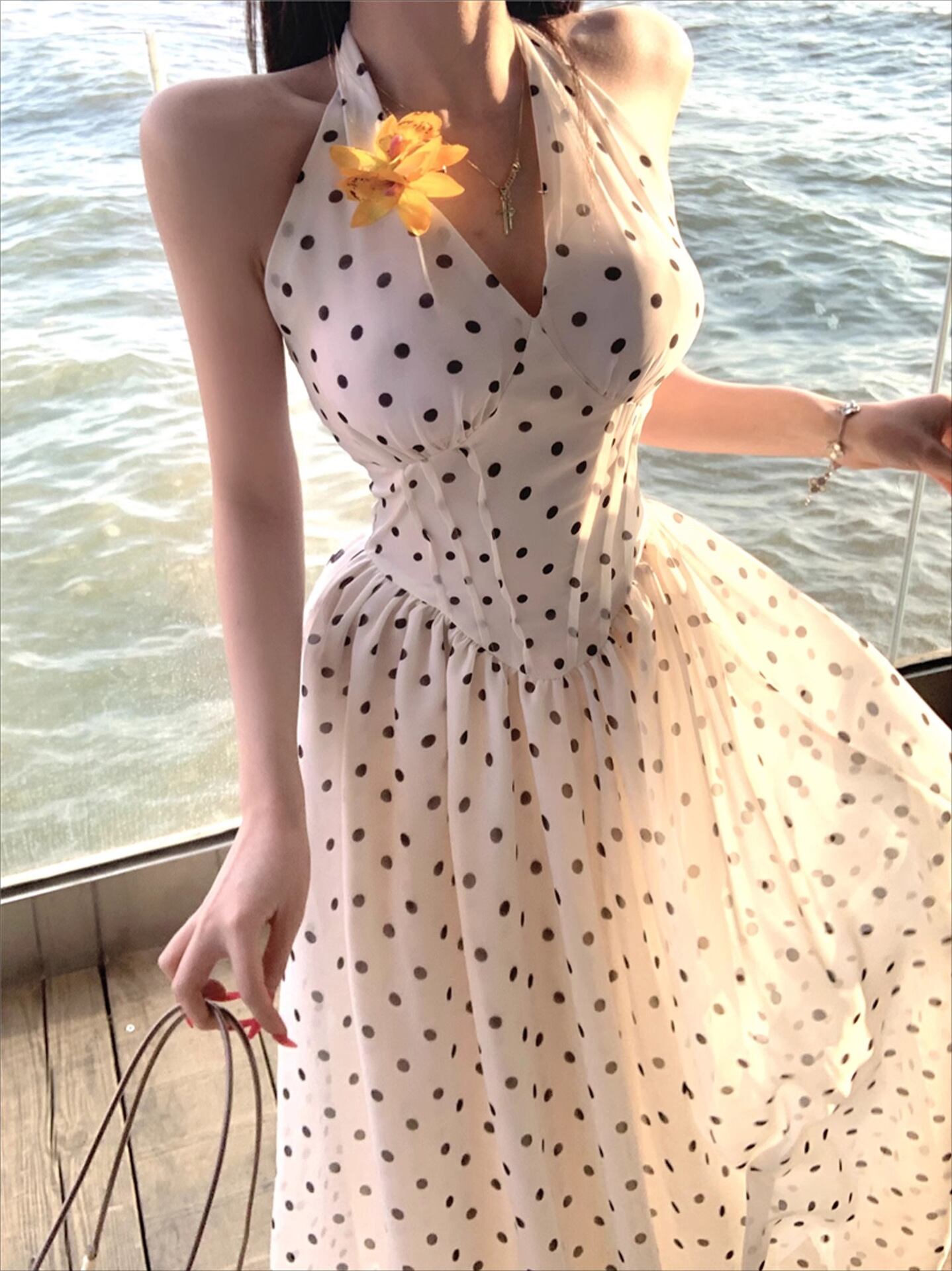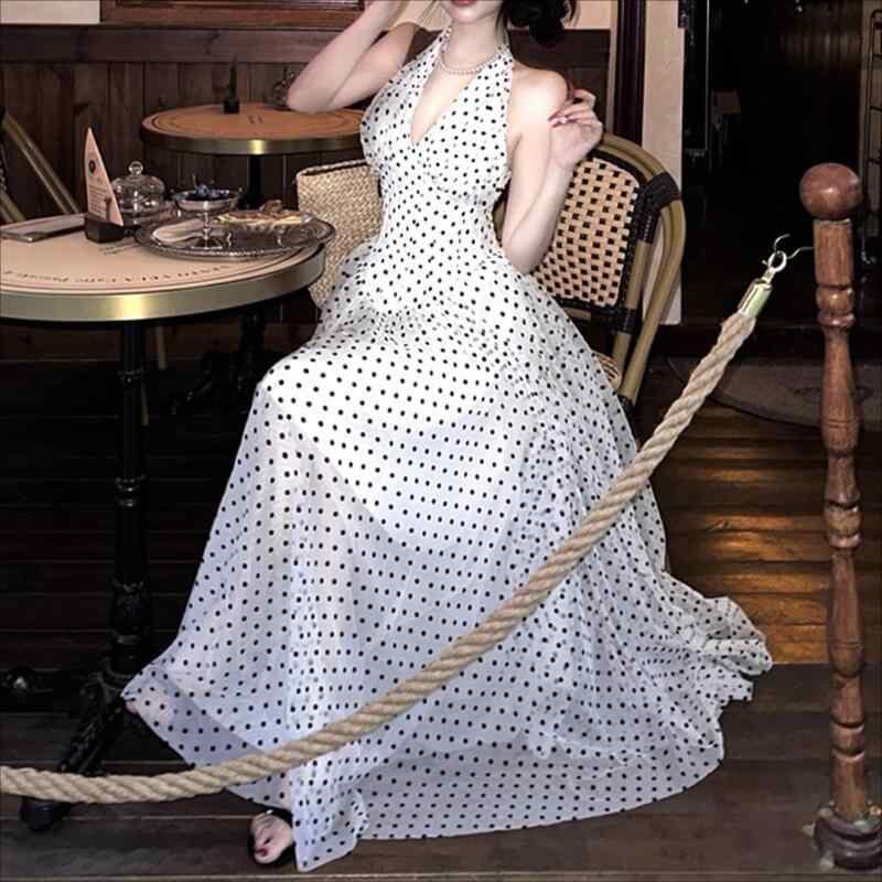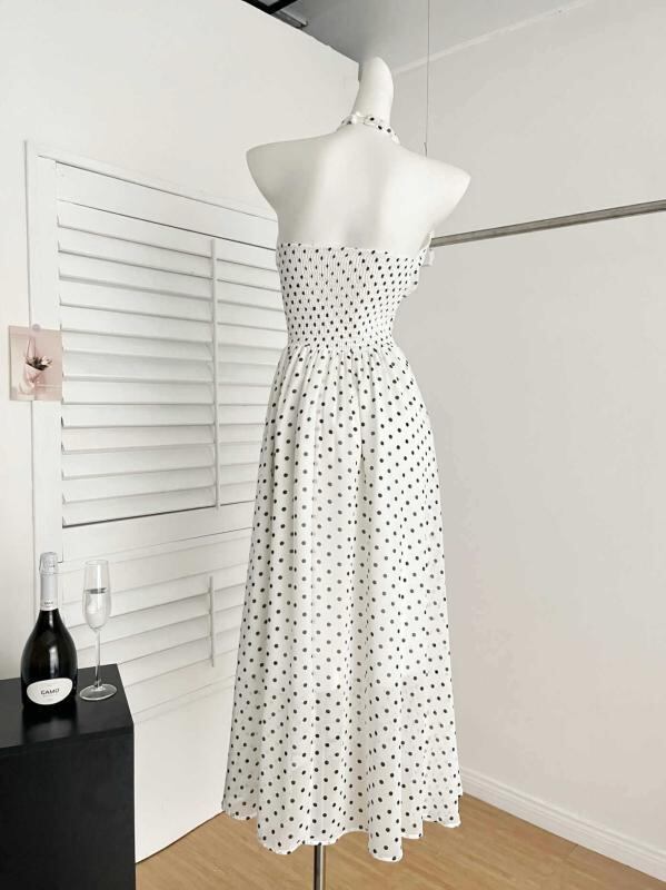 ワンピース レディース 水玉 ドット柄 ホルターネック Vネック ロング丈 マキシ丈 ウエストマーク ウエスト絞り 春夏 エレガント 上品 Aライン ノースリーブ 切り替え ポリエステル コットン