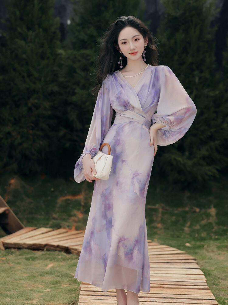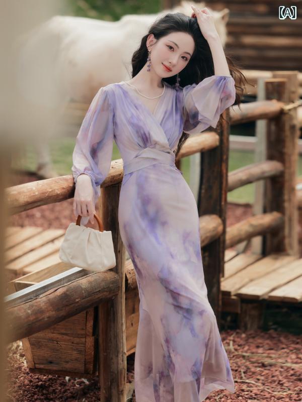 ワンピース レディース フレンチエレガント 大人可愛い Vネック パープル グラデーション シアー ランタンスリーブ 長袖 ウエストマーク ハイウエスト ロング丈 Aライン 春夏