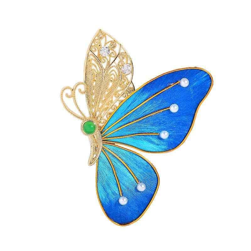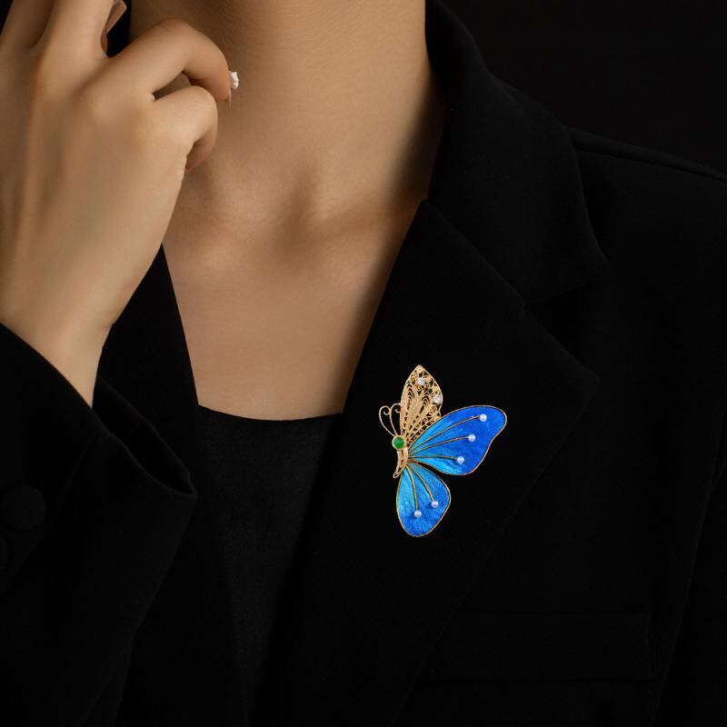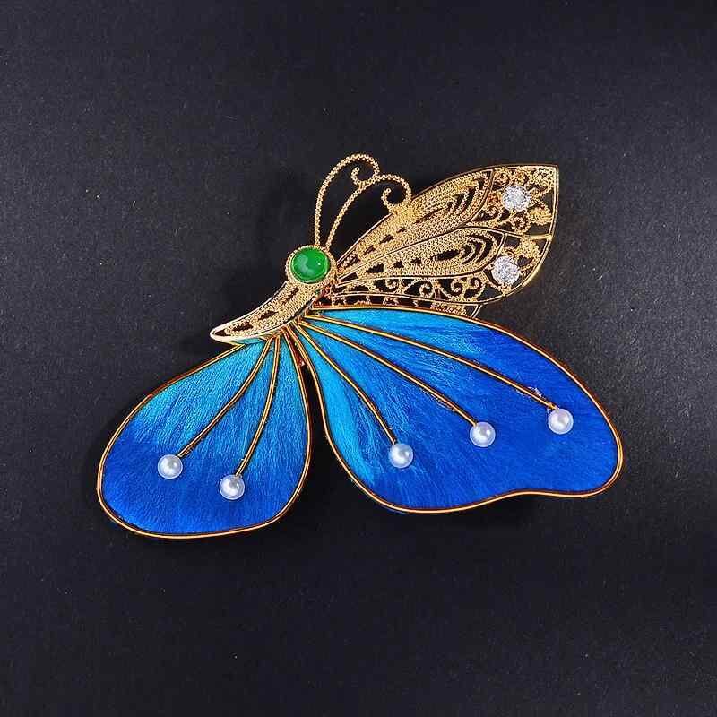 ブローチ レディース 中国風 スタイリッシュ 片羽根 蝶 高級感 エレガント 上品 華やか 銅 ジルコニア 電気メッキ加工 ブルー ライトグリーン オフィス フォーマル パーティー カジュアルスタイル