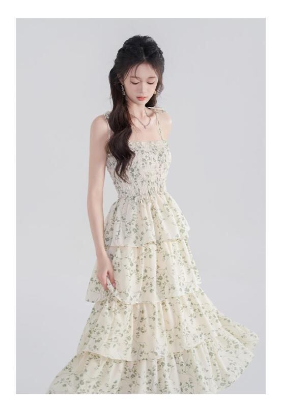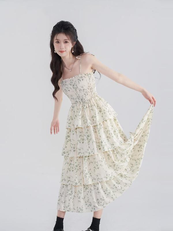 ワンピース レディース 吊りスカート ロング丈 花柄 ケーキスカート ティアードスカート ポリエステル ゆったり ギャザー入り ブラック系 きれいめ 通勤 デート 大人かわいい