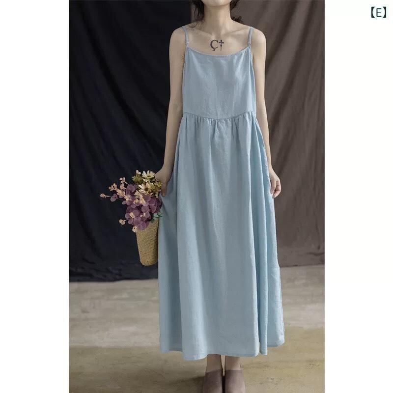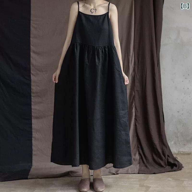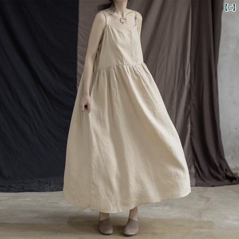 ワンピース レディース 吊りスカート ノースリーブ Aライン チュニック 亜麻 リネン ミモレ丈 ロング丈 ゆったり 文芸風 白 黒 杏色 ピンク系 水色