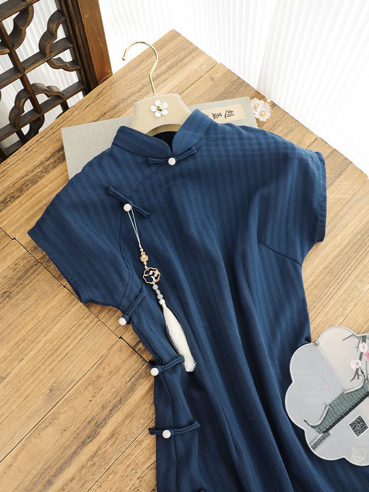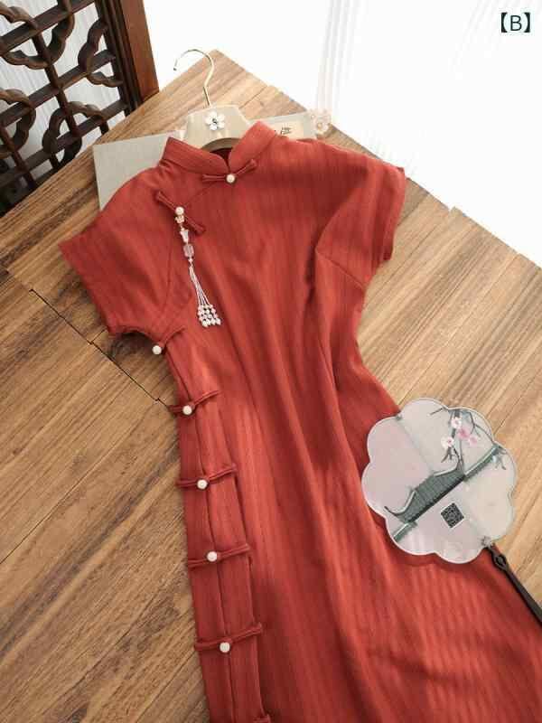 チャイナドレス ワンピース 女性用 半袖 レトロ モダン 中国風 スタンドカラー 飾りボタン 斜め前開き エレガント 上品 普段使い ポリエステル パイピング 春夏