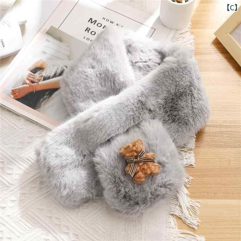 ネックウォーマー レディース スヌード フェイクファー エコファー もこもこ ふわふわ 肌触り クマ ベアモチーフ 韓国風 かわいい 厚手 防寒 保温 首元カバー クロス 学生 普段使い 白 ベージュ グレー ピンク 黒 冬 秋冬