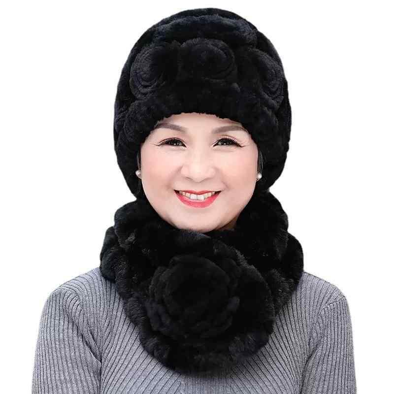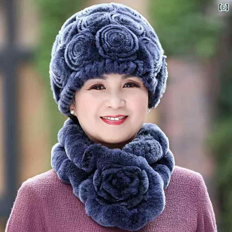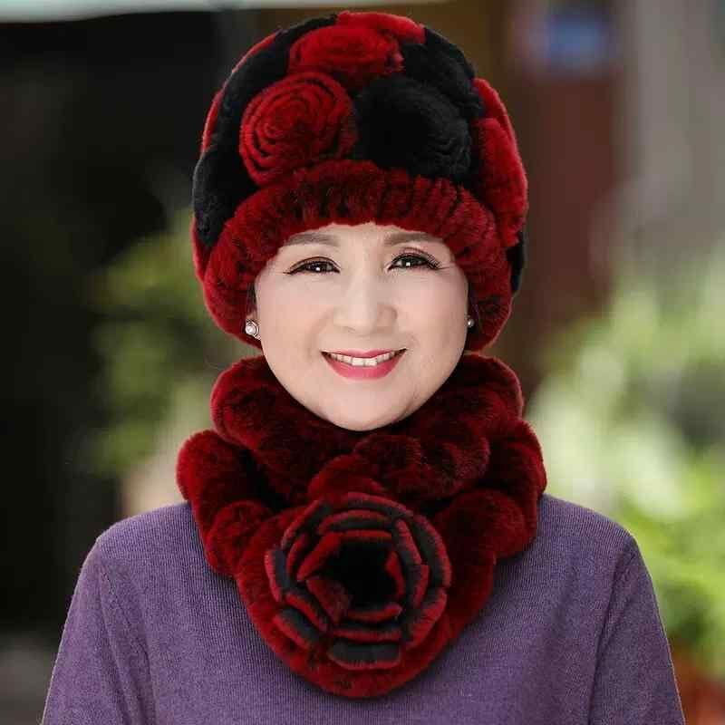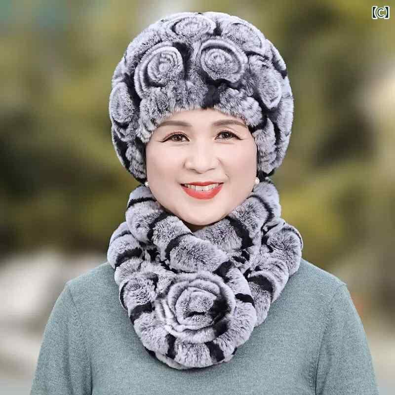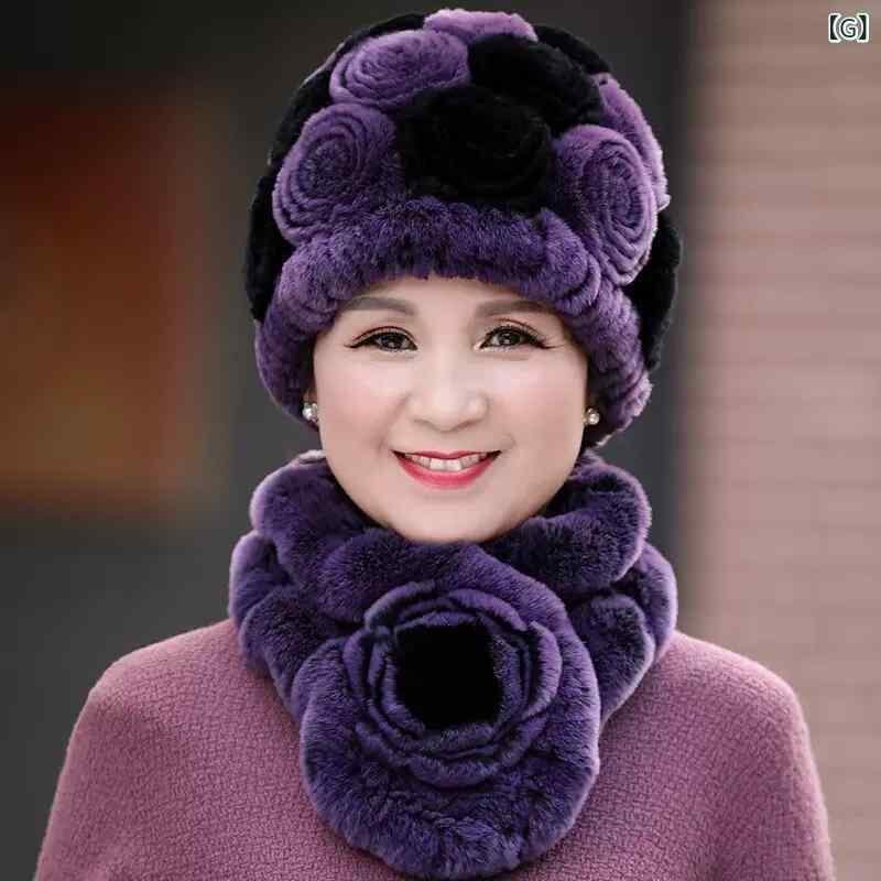ハット レディース 中高年 祖母 レッキスラビットファー 防寒 手編み エレガント 高級感 シンプル 普段使い お出かけ ラウンドトップ 冬用 マフラー セット