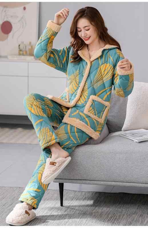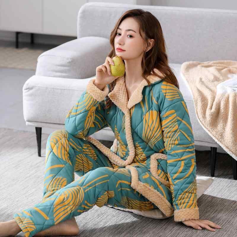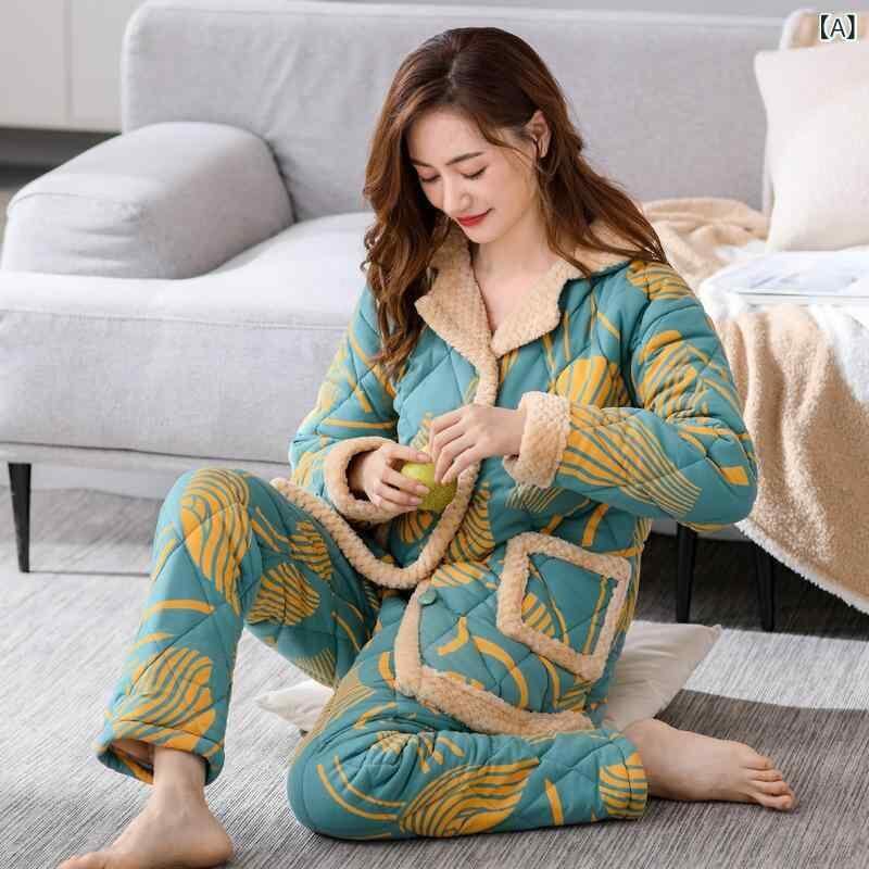 パジャマ 女性用 冬 極厚 3層仕立て 中綿入り キルティング 純綿 コットン 保温 防寒 ニット 開襟 前開き 長袖 ロングパンツ ルームウェア 部屋着 快適 高級感