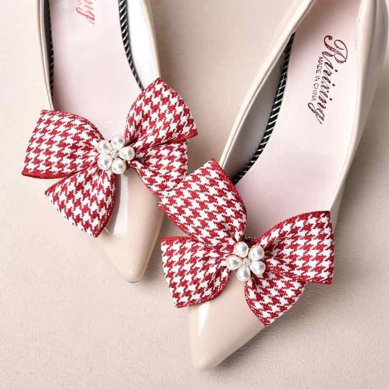 靴飾り レディース 女性用 ブライダル ウェディング 結婚式 ブラック レッド チェック柄 リボン 蝶結び 合金製 装飾 バックル クリップ 2個セット