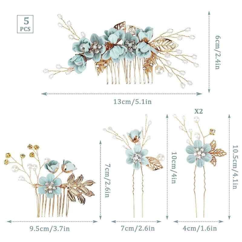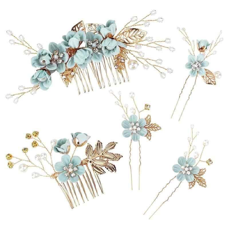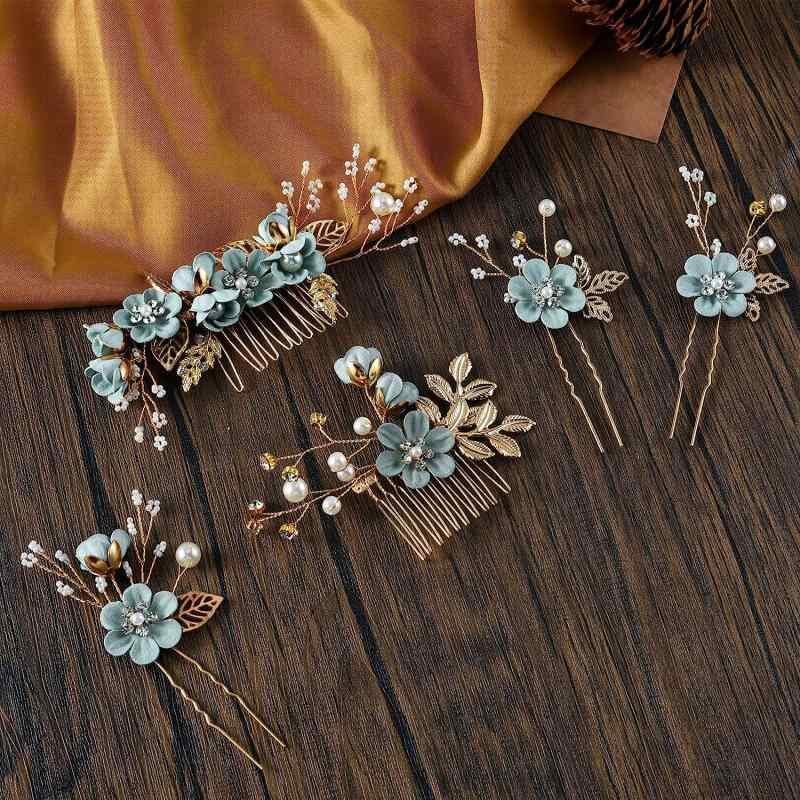 ヘアアクセサリー レディース 結婚式 ブライダル ウェディング 髪飾り フラワー 花 5点セット メタル製 ヘアコーム かんざし ヘアピン カラフル 青 ピンク 緑