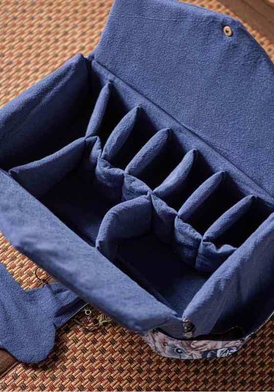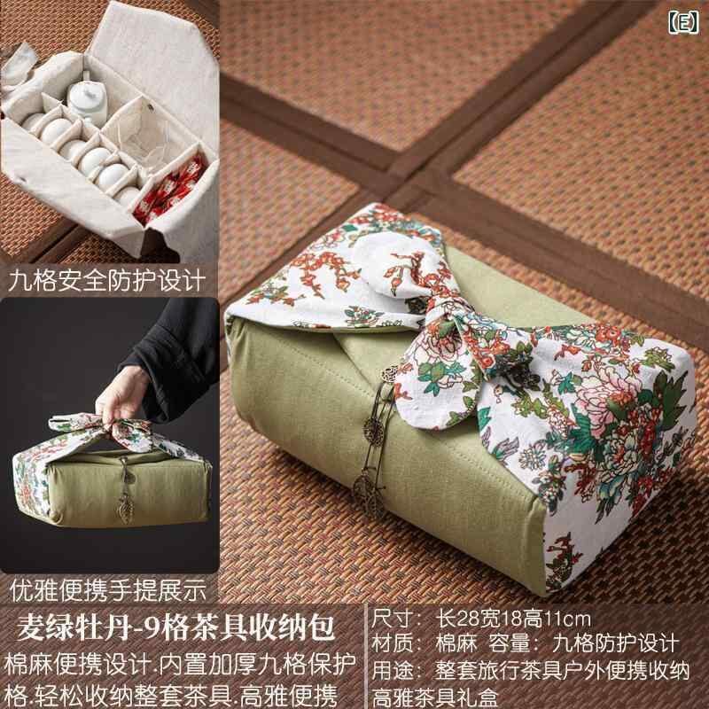 茶器 収納バッグ アウトドア 旅行用 自宅用 手提げ 携帯 ポータブル 大容量 9マス 仕切り付き 綿麻 布製 中華風 茶道具 収納ポーチ