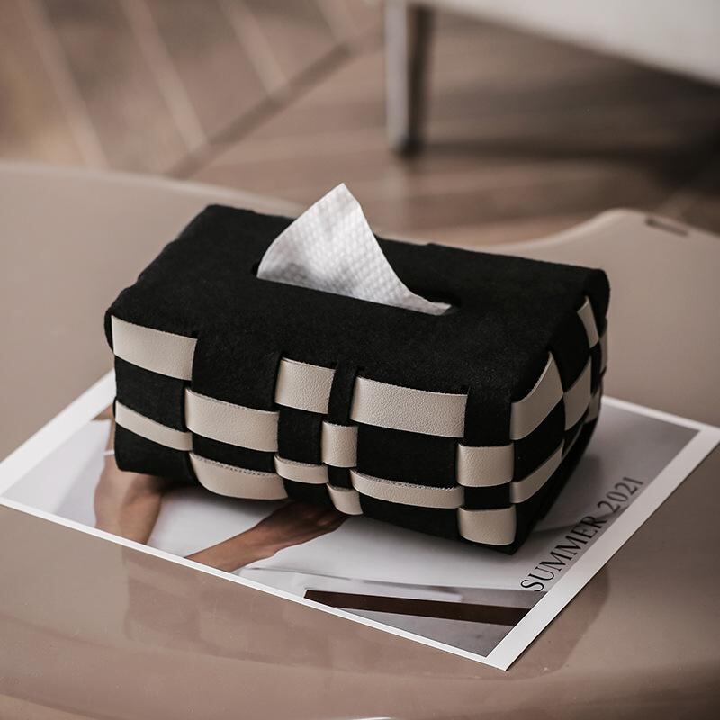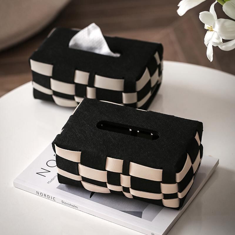 ティッシュケース 北欧風 市松模様 チェック柄 編み込み レザー調 高級感 上質 ラグジュアリー 多機能 家庭用 リビング 寝室 卓上 デスク 車内用 ペーパータオルケース ブラック ベージュ グレー
