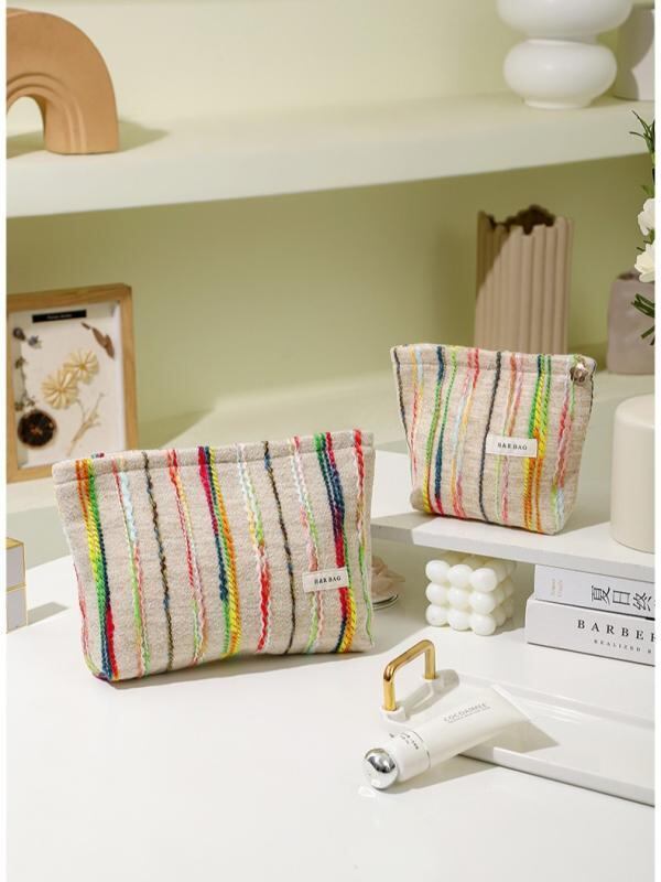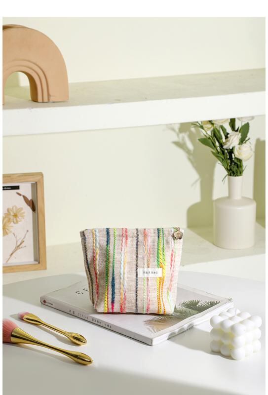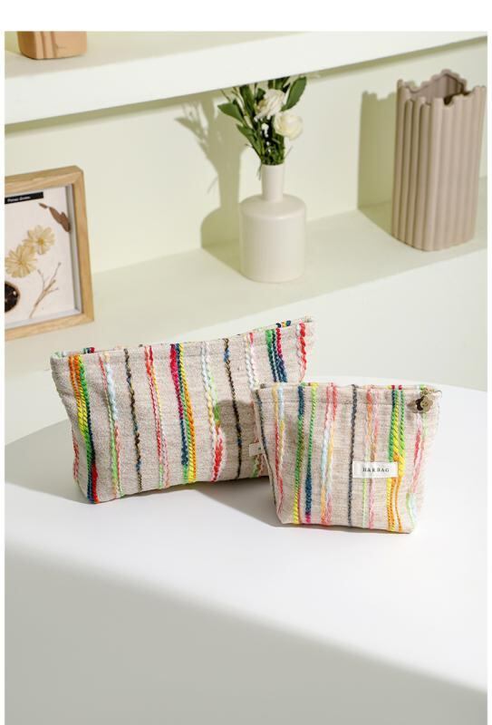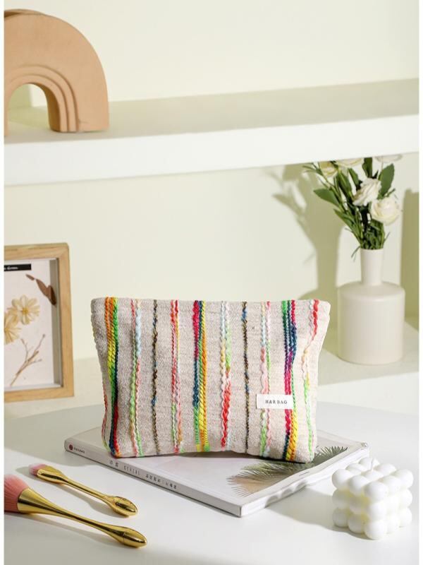 ポーチ レディース 女性用 化粧 コスメ メイク トラベル 洗面 バスルーム用 ハンドバッグ クラッチ 手提げ鞄 大容量 携帯 旅行 日常使い 収納 フェルト ストライプ柄 切り替え オフホワイト アイボリー