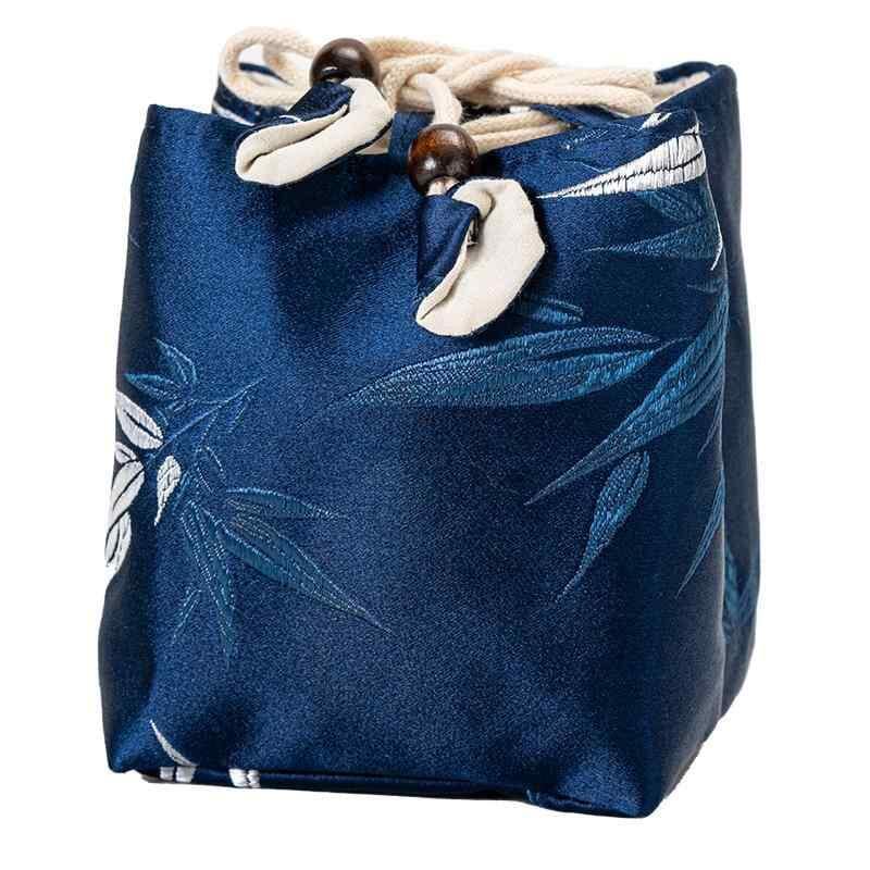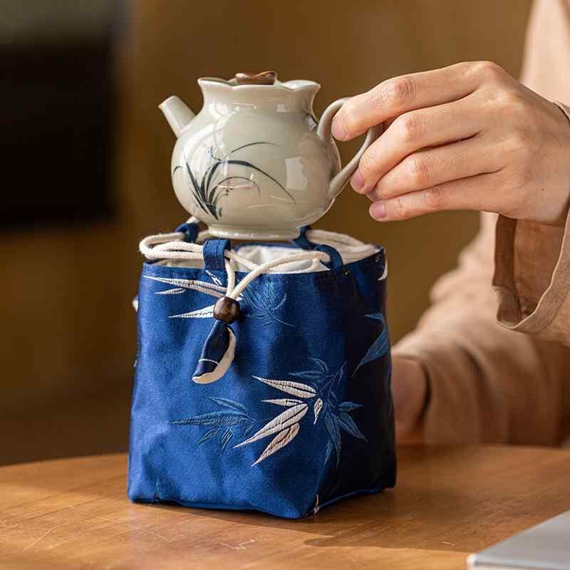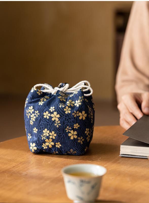 収納袋 綿麻 錦織り 厚手 急須 茶器 茶道具 携帯用 トラベルポーチ 巾着 紐付き 竹柄 花柄