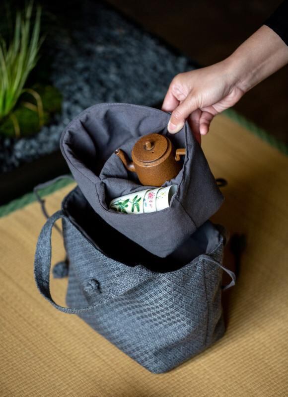 茶器収納ケース 茶道具一式 携帯用 旅行 トラベル ポータブルバッグ 綿麻布製 厚手 キルティング クッション保護 手提げ鞄 和モダン アジアンテイスト