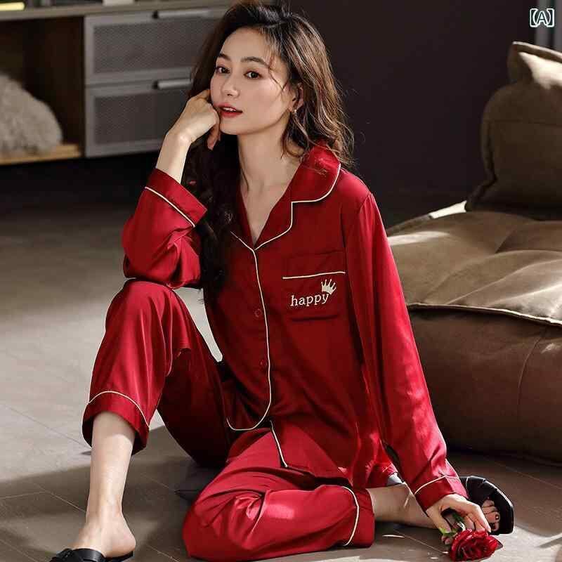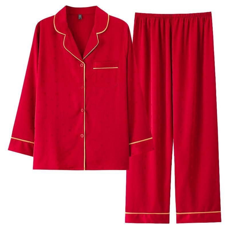 パジャマ レディース ルームウェア 春夏秋 接触冷感 長袖 前開き 薄手 襟付き 通気性 快適 ポリエステル 赤 レッド 結婚式 ブライダル 新婚旅行 普段使い 部屋着 上下セット セットアップ