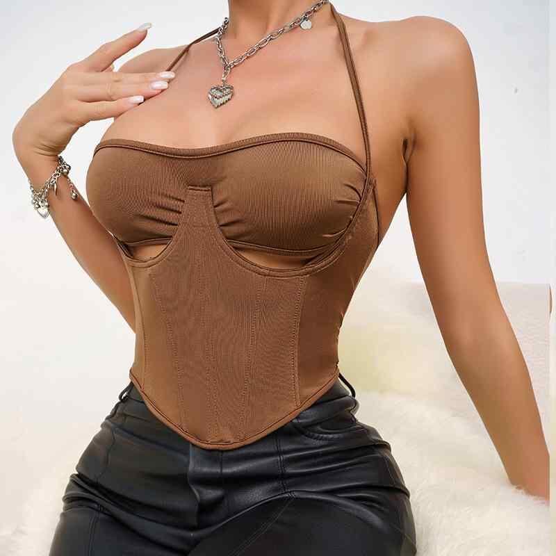 ビスチェ レディース ホルターネック レースアップ カットアウト ボーン入り コルセット風 ウエストマーク セクシー ボディコン トップス 欧米ファッション ポリエステル ブラウン