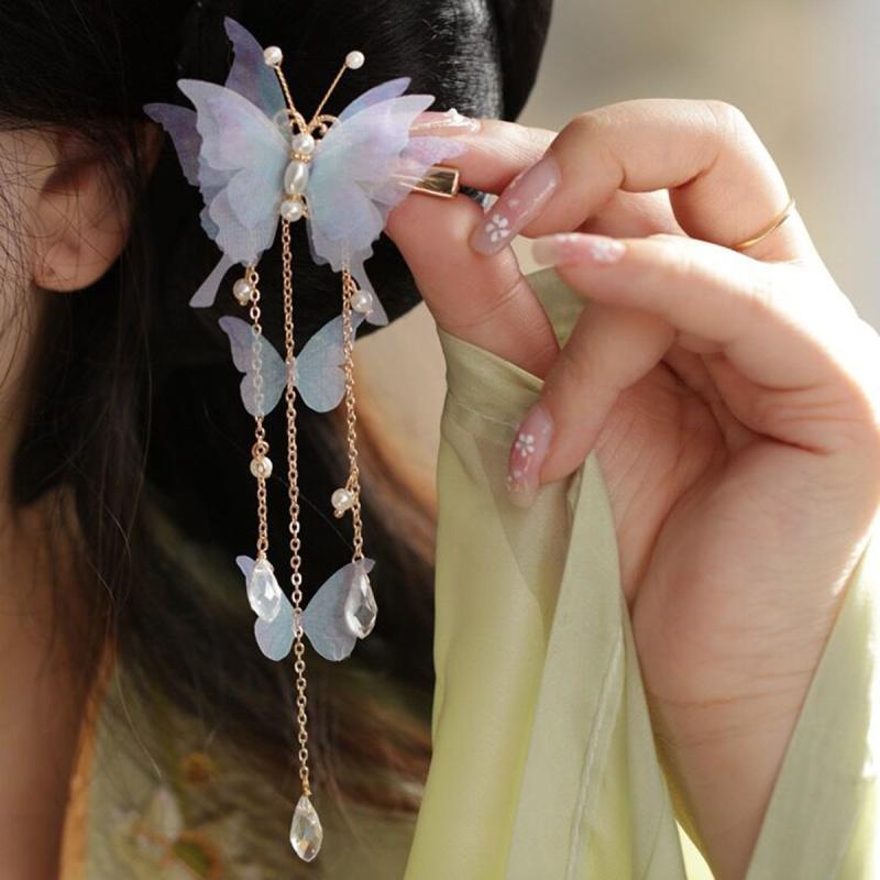 ヘアクリップ レディース 蝶 バタフライ 流蘇 タッセル 漢服 宋唐風 サイドクリップ 左右セット パープル シンプル エレガント 髪飾り 合金製 可憐 春夏