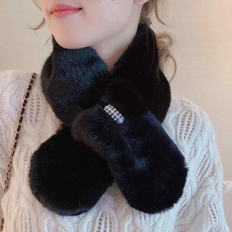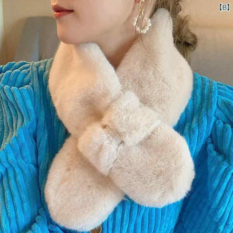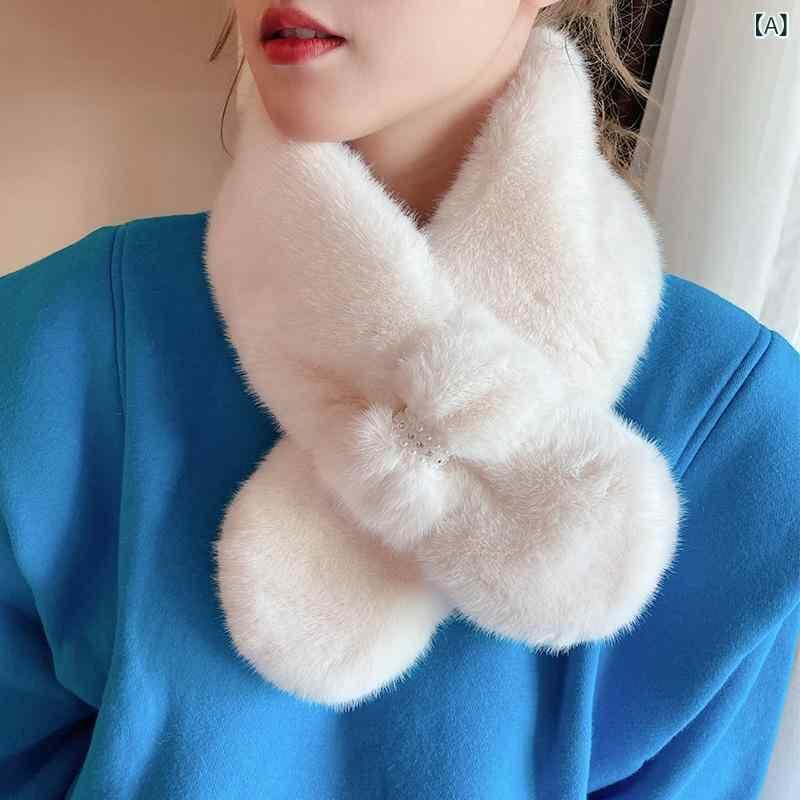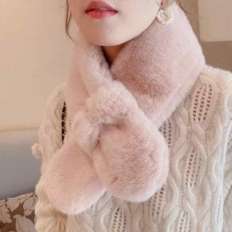 マフラー レディース 女性用 フェイクファー ラビットファー風 もこもこ パール付き クロス 厚手 ミニ ショート 暖かい 保温 防寒 冬 韓国風 かわいい 上品 きれいめ カジュアル