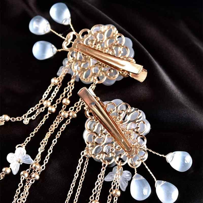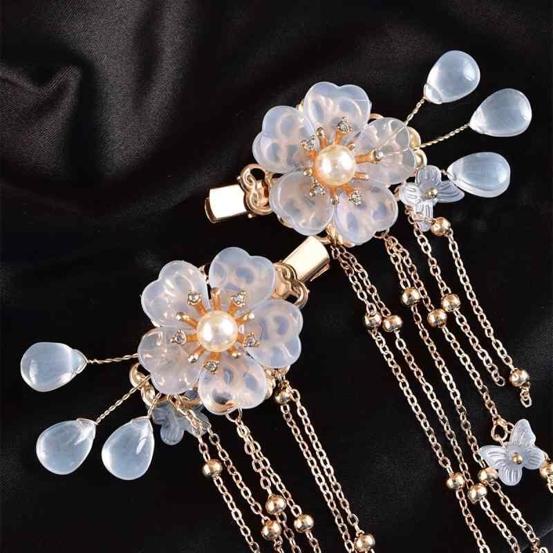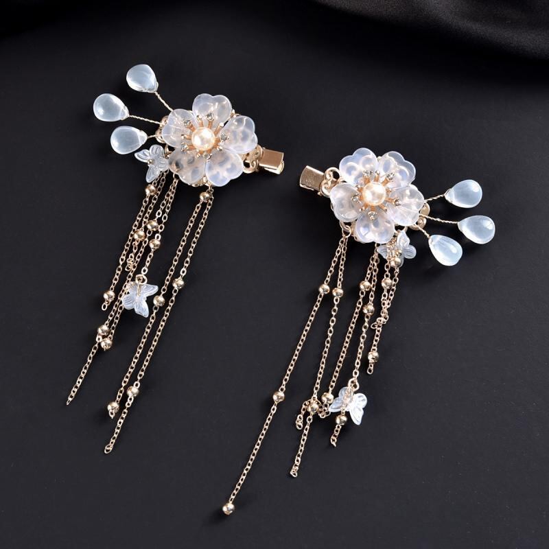 ヘアクリップ レディース 古風 真紅 合金 琉璃 ガラス細工 花 フラワー ドロップ しずく タッセル フリンジ チャーム 髪飾り 浴衣 和装 夏祭り カジュアル 上品 エレガント 2個セット ペア