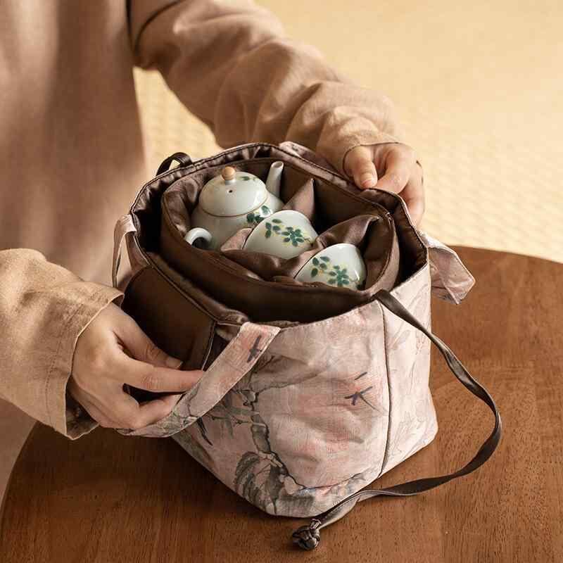 茶器セット レディース 携帯用 ポータブル 一煎瓶 二客湯呑 収納バッグ アウトドア 旅行用 手提げ トート 布製 新中式デザイン 茶道用品