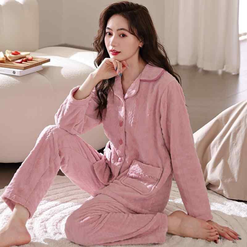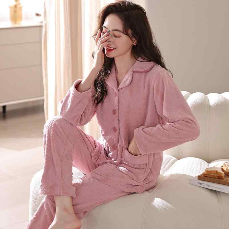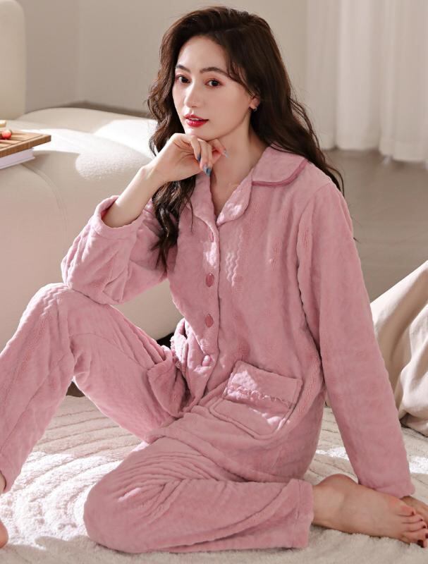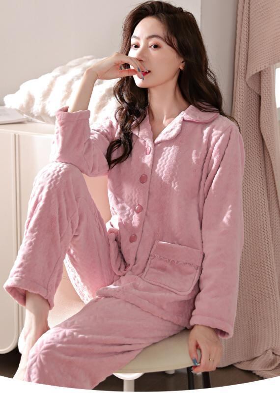 ["・カテゴリ: パジャマ","・主な素材: ポリエステル","・生地: フランネル","・デザイン: 前開き","・厚さ: 厚手","・生地の厚さ: 超厚手(301-350g/m²)","・ネックライン: 襟付き","・袖丈: 長袖","・パンツ丈: 長ズボン","・機能: リラックス、通気性、保温性、快適、部屋着、外出着","・対象: 中年女性","・シーン: アウトドア、部屋着","・サイズ展開: M (目安40-50kg)、L (目安50-60kg)、XL (目安60-70kg)、XXL (目安70-80kg)、3XL (目安80-90kg)","・スタイル: シンプルカジュアル"]
