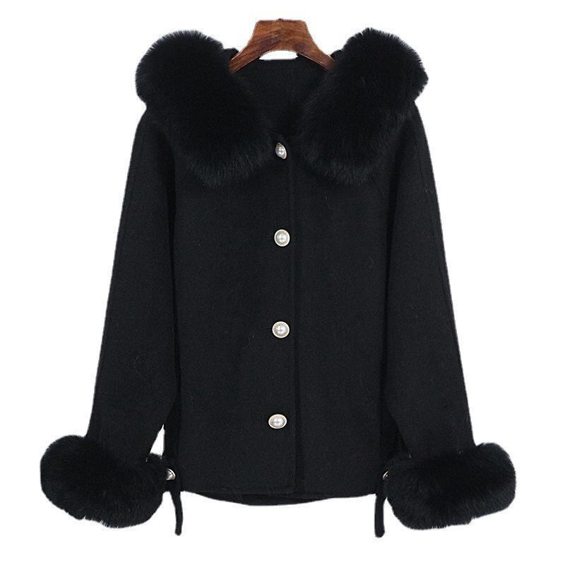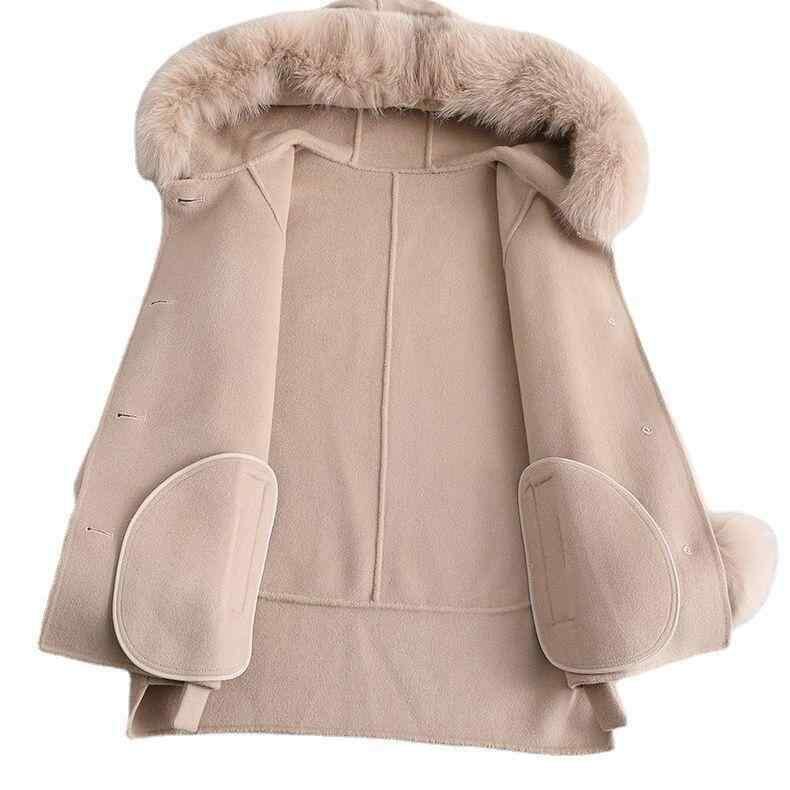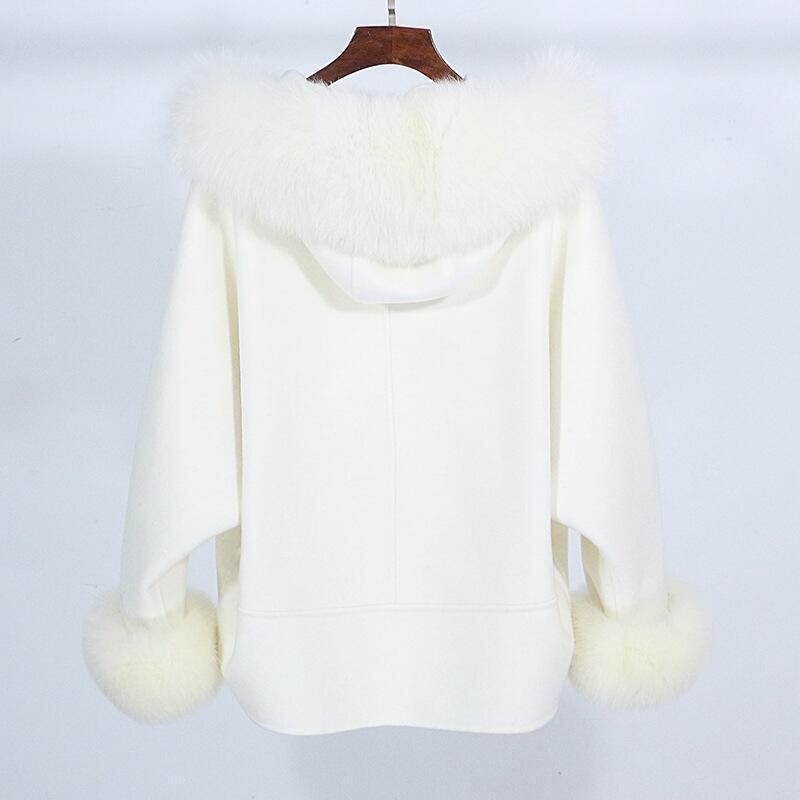 コート レディース ダブルフェイス カシミヤウール 高級感 フォックスファー襟 フード付き ショート丈 ゆったり ドルマンスリーブ 厚手 あったか 秋冬 ブラック ホワイト カーキ