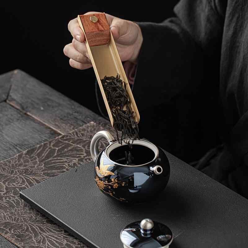 茶道具 四点セット 茶器 家庭用 自宅用 来客用 高級感 木製 天然木 花梨木 黒檀 銅飾り 茶さじ 茶挟み 茶筆 新中華風 アジアンテイスト 置物