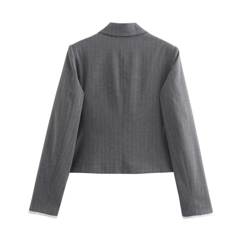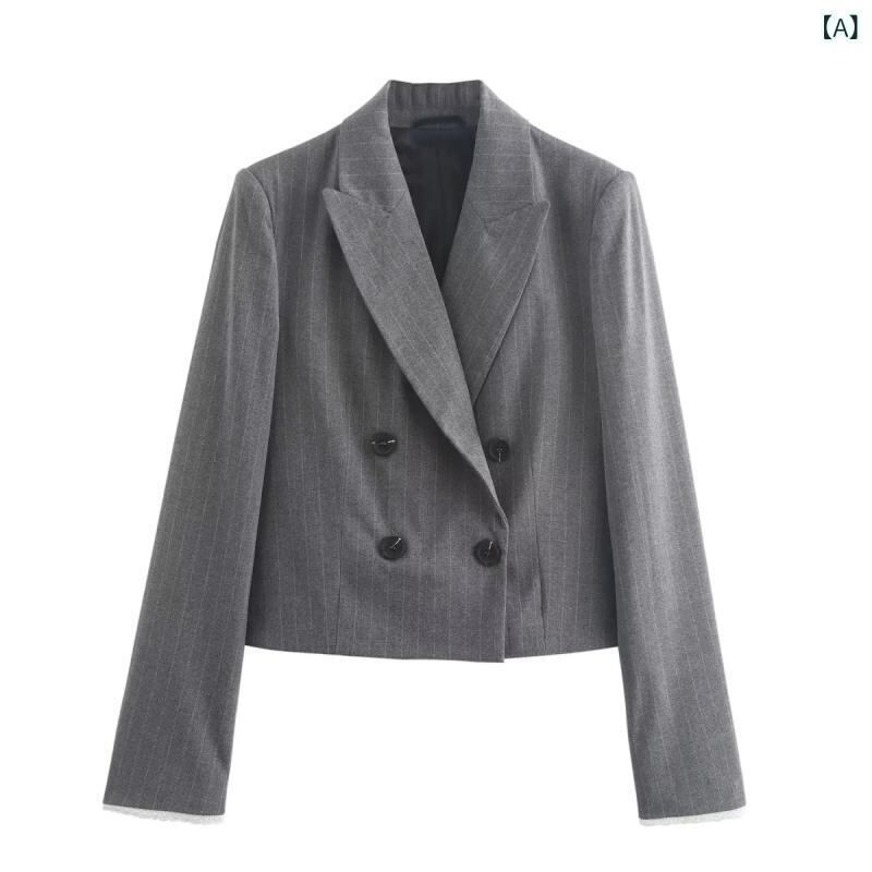 ジャケット レディース 欧米風 上品 エレガント 着回し万能 高級感 グレー 細ストライプ ショート丈 長袖 テーラードカラー ダブルボタン 切り替え ポリエステル素材 カジュアルスタイル 秋冬