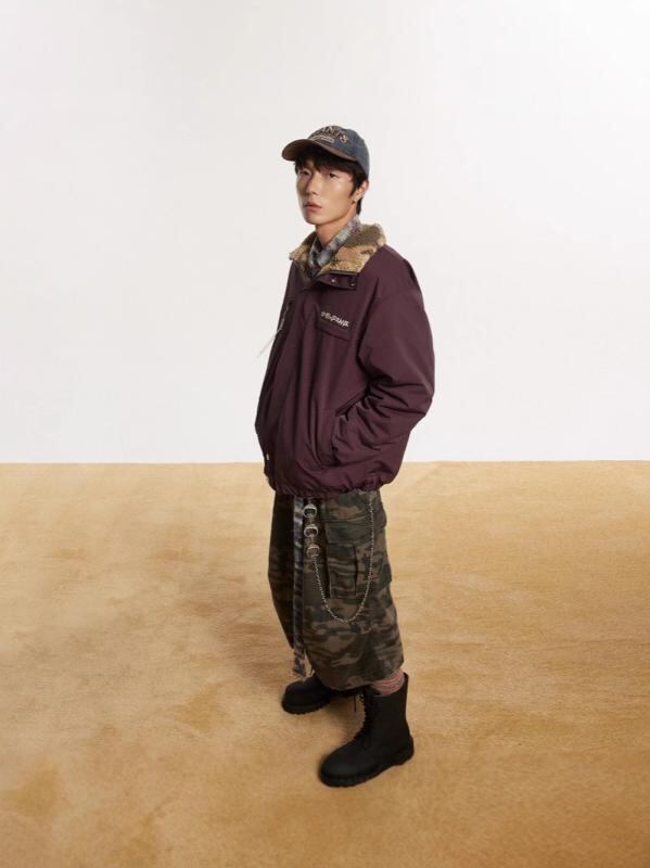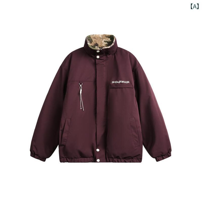 中綿ジャケット ユニセックス アメリカンレトロ ワークテイスト 迷彩柄 ダークパープル スタンドカラー リバーシブル ルーズシルエット ボア 裏地 厚手 防寒 秋冬 カップル ペア