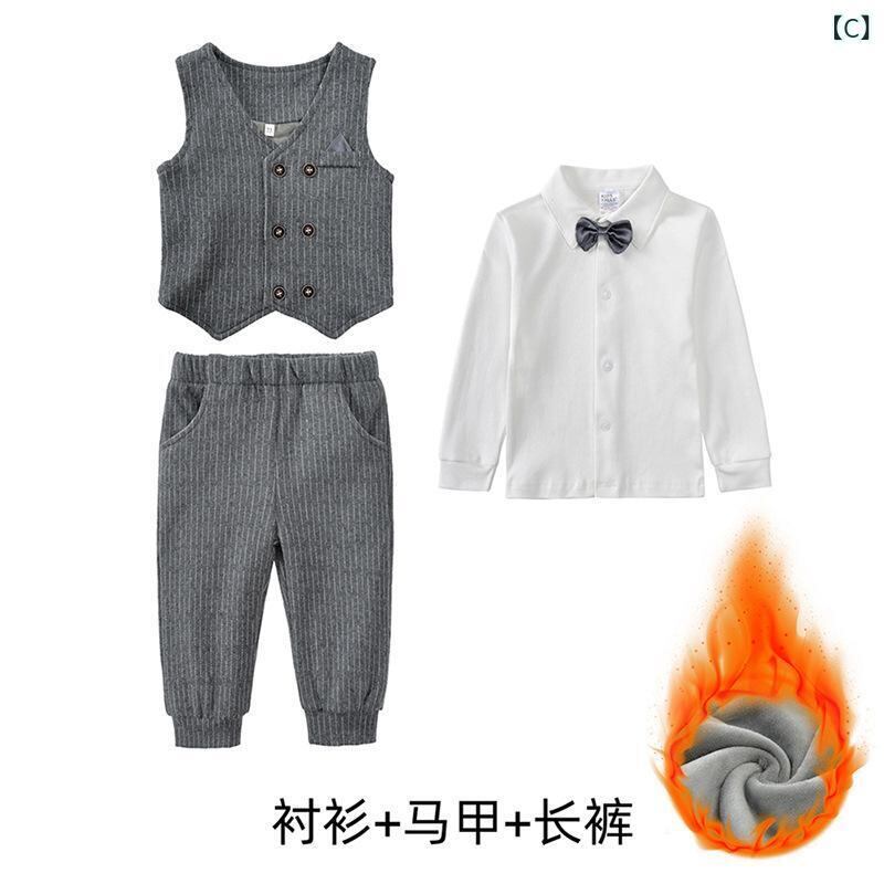 ・カテゴリ: 子供服セット・性別: 男・スタイル: ブリティッシュ・セットタイプ: パンツスーツ・セット内容: 3点セット・対象年齢: 1〜3歳児 (80〜100cm)・季節: 冬、秋・袖丈: 長袖・ズボン丈: ロング・生地加工: ソフト加工・厚さ: 厚手・主な素材: 綿95%・留め具: シングルボタン・サイズ展開: 73cm、80cm、90cm、100cm、110cm