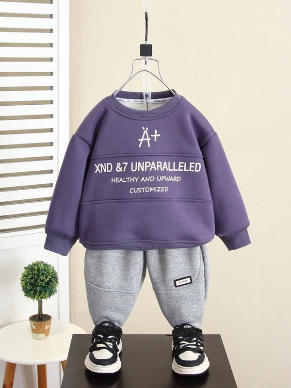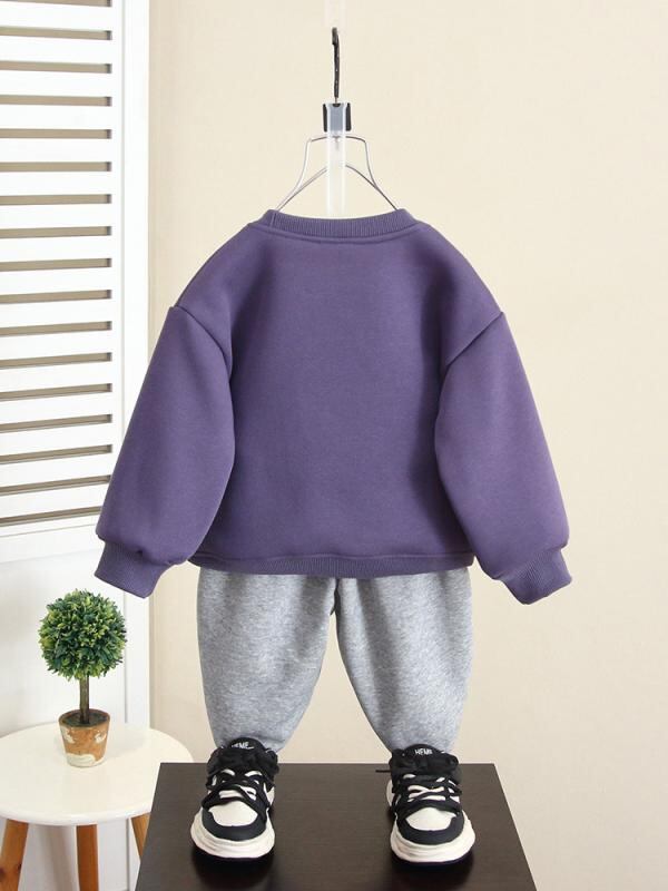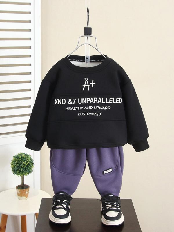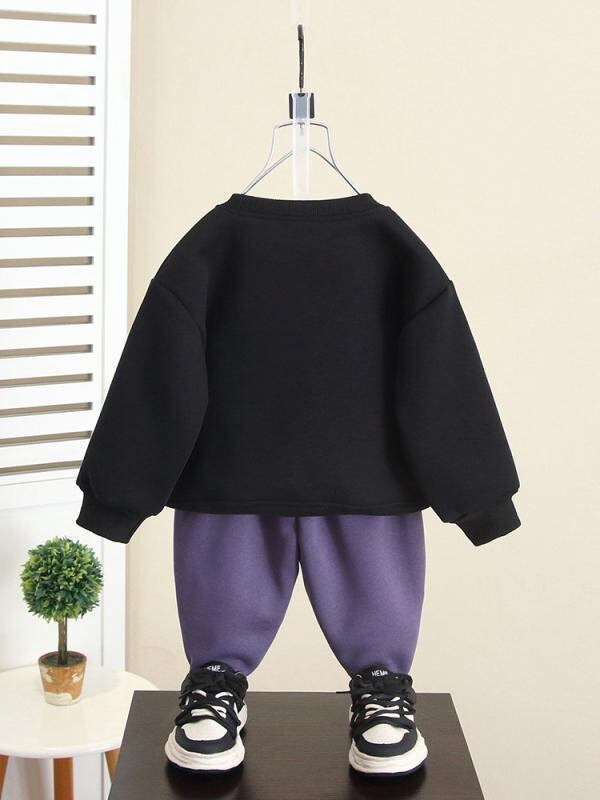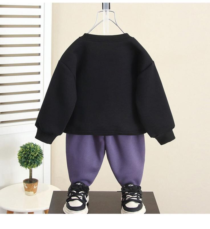 ["・性別: 男性","・スタイル: 韓国風","・セットアップタイプ: パンツセット","・セット内容: 2点セット","・内容: 衣類","・対象年齢: 3~8歳 (身長100~140cm)","・袖丈: 長袖","・パンツ丈: ロング","・生地加工: 柔軟加工","・厚み: 厚手","・柄: キャラクター","・特徴: スポーツ、セットアップ、トレンド","・主な素材: 綿53%","・開閉タイプ: プルオーバー","・カラー展開: パープル、ブラック","・サイズ展開: 90cm、100cm、110cm、120cm、130cm、140cm、150cm","・カテゴリ: 子供服セット"]